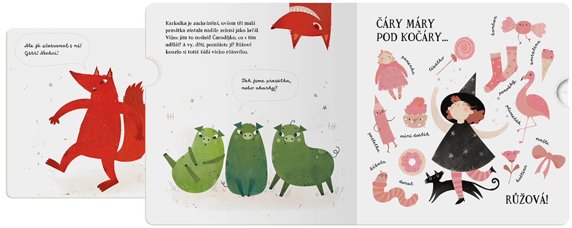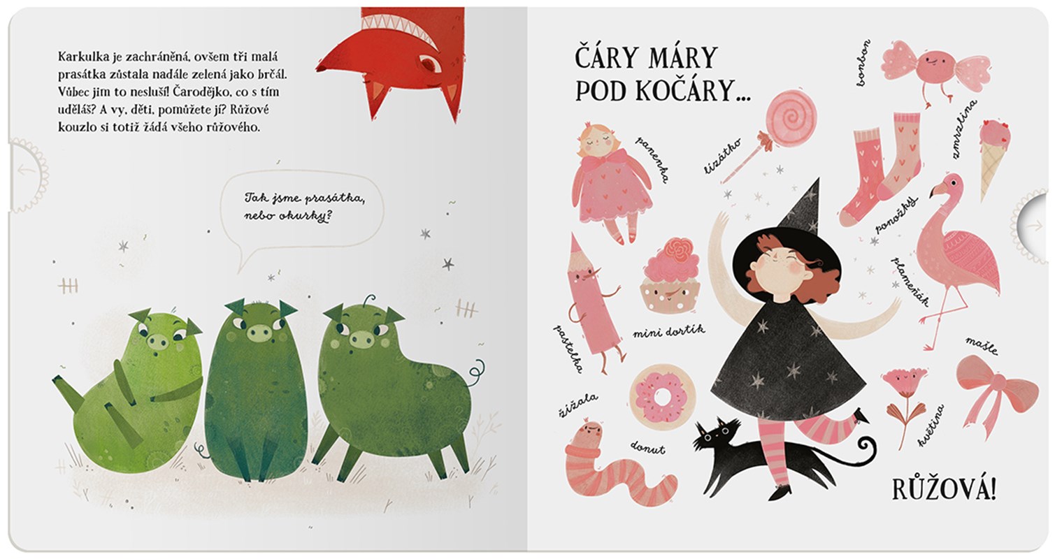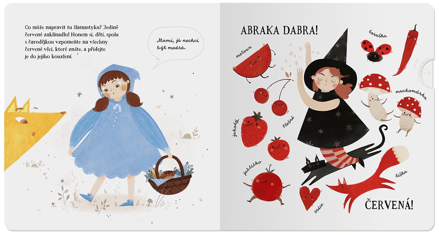 „Hmmm… Já bych si tak dala dort!“ zasnila se jednou jedna malá čarodějka. „Abrakadabra…!“ A bylo to. Ajéje. Tohle nejspíš nebylo to správné zaklínadlo. Všechny pohádkové bytosti od Karkulky až po zubatou saň mají teď úplně jinou barvu, než jakou mají správně mít. Uznejte samy, děti, viděly jste už někdy modrou Karkulku? Tři zelená prasátka najednou vypadají, jako by snědla k snídani salát a smutná Zlatovláska si může oči vyplakat nad svými stříbřitě šedivými vlasy. Pomůžete čarodějce nevydařené kouzlo napravit?