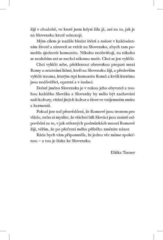 Narodila se třináctileté romské prostitutce z východoslovenského ghetta, její otec je německý neonacista vydělávající si na ilegálních zápasech. Těžko uvěřitelná rodinná situace Elišky Tanzer předznamenává její výjimečný osud – ve třinácti letech ji matka pošle do Anglie za lepším životem. I přesto, že Eliščiny sny se mnohdy mění v noční můry, nevzdává se naděje. Tohle je její příběh. Skutečný příběh odhodlání, odvahy a neuhasitelné touhy po vzdělání.