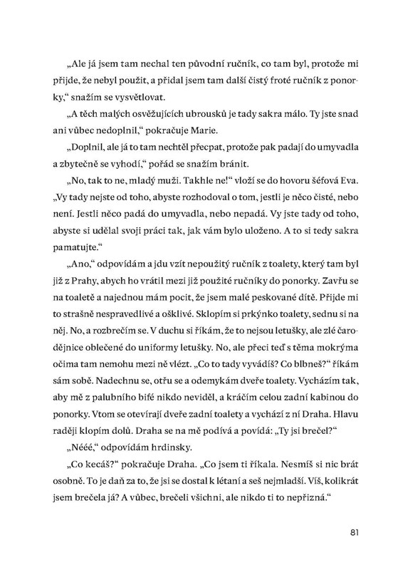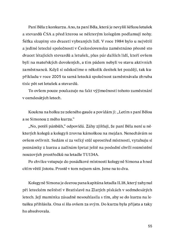 Den D nastal. Ten podzimní den roku 1983 je velmi sychravý. Prší, mraky visí skoro na zem. Vcházím do Budovy posádek a štráduju si to po schodech nahoru do prvního patra. Mezitím pozoruji ty šťastné, které tento stres mají již dávno za sebou a připravují se na odlet svých letů. Poslouchám jednu letušku, která zavelí do okolí: „Curych, jdeme!“ Další se hrabe ve svém velkém kufru v přízemí, kde stojí několik dalších velkých kufrů. Kolemjdoucí se u ní zastaví a říká jí: „Prosím tě, a nezapomeň mi v New Yorku koupit ten svetr, na který jsme se minule spolu koukali. Však víš.“