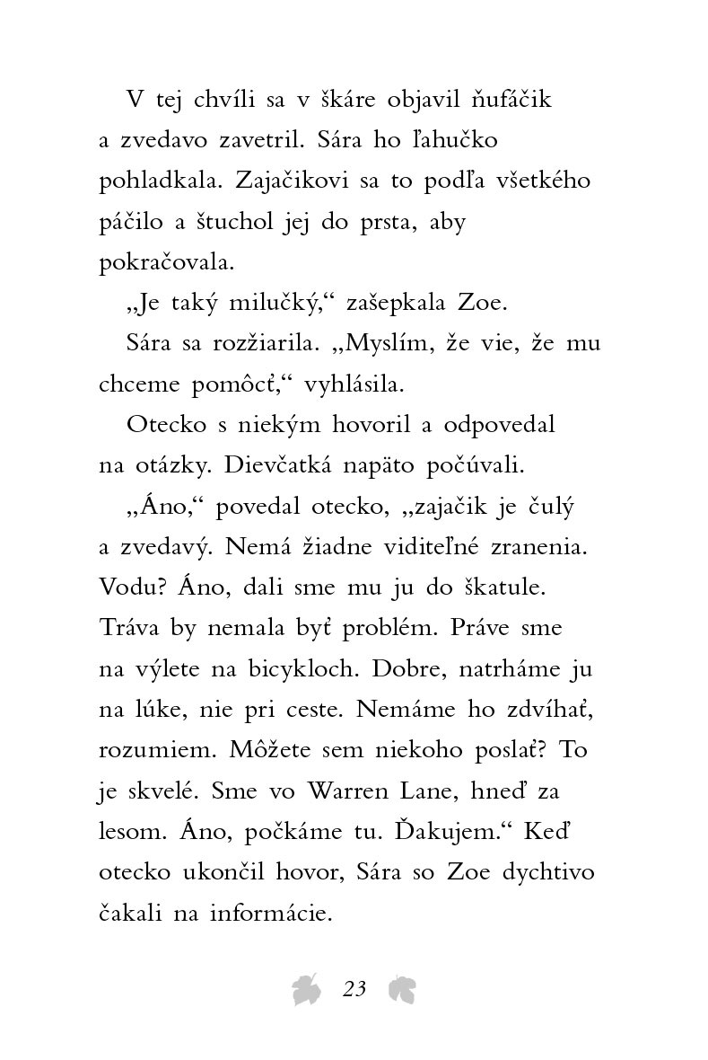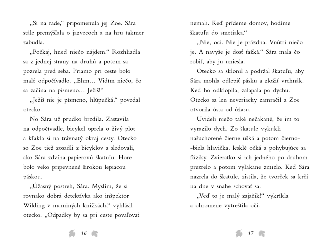 Malá Sára nájde pri ceste vyhodenú škatuľu s malým zajačikom. Otecko zavolá zvieracím záchranárom, ktorí si poňho prídu. Opusteného chlpáčika prezrú a odvezú na miestnu záchrannú stanicu.