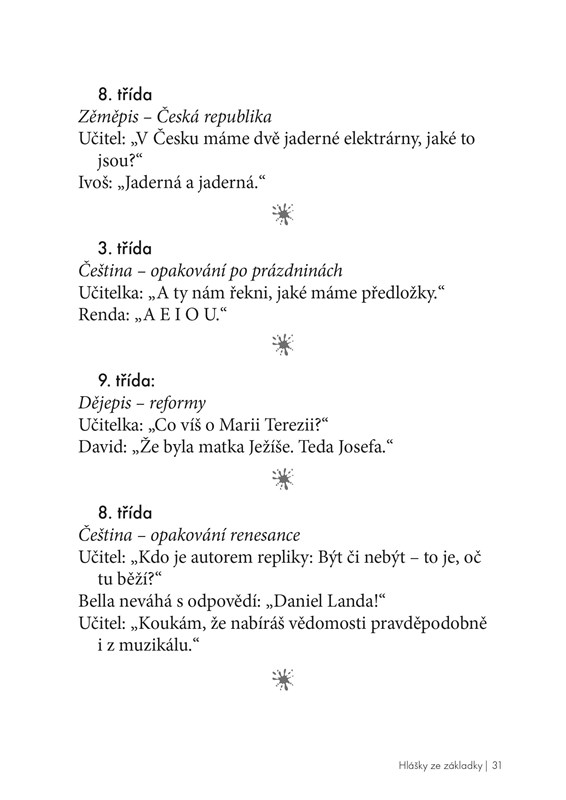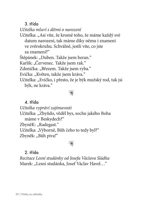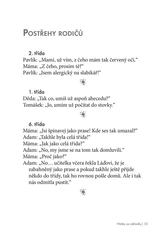 Hlášky ze základky stoprocentně vykouzlí úsměv na tváři všem žákům, kteří si jimi zpestřují mnohdy nelehký život ve školních lavicích. S velkou chutí si je zajisté prolistují i dospělí: učitelé, školníci, kuchařky, družinářky a v neposlední řadě rodiče. Knížka je plná přeřeků, vtipných poznámek i zážitků přímo z hodiny a také postřehů z online výuky.