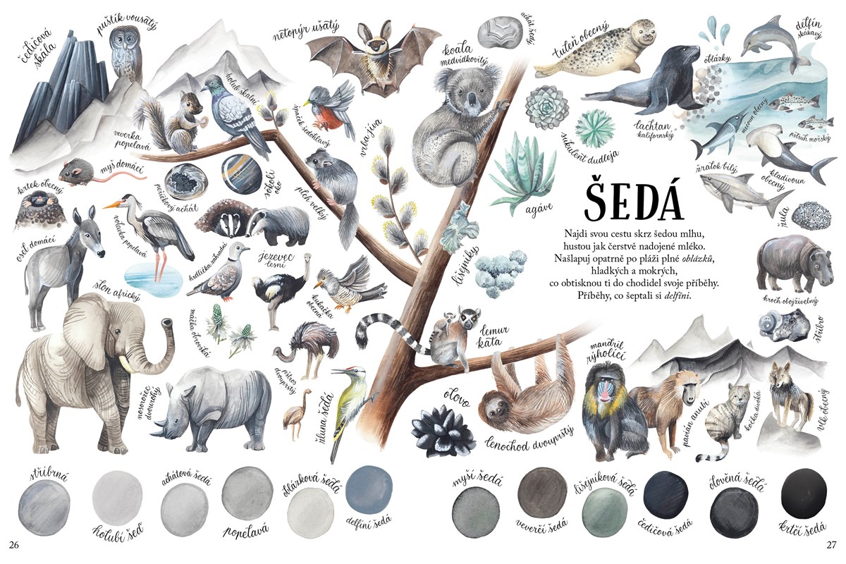 Příroda hraje všemi barvami. Ale jak by třeba taková zelená, žlutá, růžová nebo modrá mohly chutnat nebo vonět? Který zvuk by mohly připomínat? Jaké by mohly být na dotek? Věděli jste, že spousta jemných barevných odstínů má svá jména po rostlinách, zvířatech nebo nerostech? Vydejte se s námi na procházku paletou 12 nejznámějších barev a jejich odstínů, které jsou mnohdy úzce a důmyslně propojeny s pestrobarevným světem rostlin, živočichů a kamenů. Lidé je tak mohou mezi sebou snadněji rozlišovat nebo si je lépe zapamatovat. Najdete všechna spojení? V závěru knihy se naučíte míchat barvy stejně znamenitě, jako to umí právě příroda!