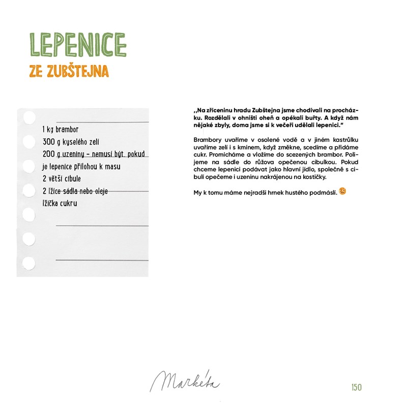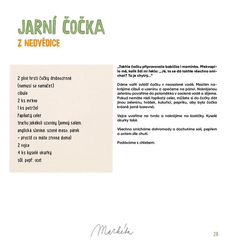 Kuchařská kniha známé herečky Markéty Plánkové a jógové lektorky a herečky Petry Špindlerové propojuje recepty s atraktivním pozváním do zákulisí života oblíbených celebrit. Herečky jsou dlouholeté přítelkyně, které jezdí s rodinami na chalupu do stejné vesnice na Vysočině a předávají si recepty, které chutnají celé rodině. Kniha je rozdělena do kapitol podle ročních období a jednotlivé recepty jsou protkané historkami z kuchyní obou hereček a jejich vlastními profesními i kulinárními zkušenostmi. To vše doplněno řadou fotografií z autentického prostředí chalup obou hereček.