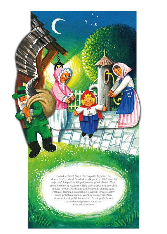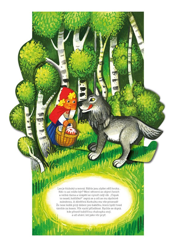 Karkulka je právě na cestě k babičce, když v lese potká velkého zlého vlka. Důvěřivá holčička mu prozradí, kam má namířeno, a vychytralý vlk už kuje plány. Jak to všechno dopadne? Přečtěte si originálně provedený příběh o děvčátku s červenou čepičkou, který je ideální pro všechny milovníky klasických pohádek. Prostorově zpracované knížky Vojtěcha Kubašty si oblíbili čtenáři po celém světě.