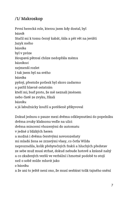 Sbírka básní, které vznikly jako zápisy z pozorování makroskopem, vzácným a podivuhodným nástrojem hvězdářů, lunatiků a básníků.