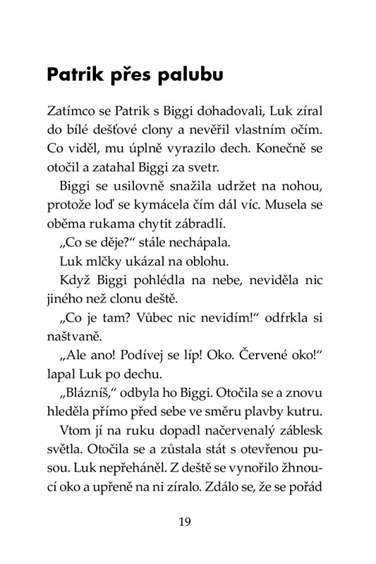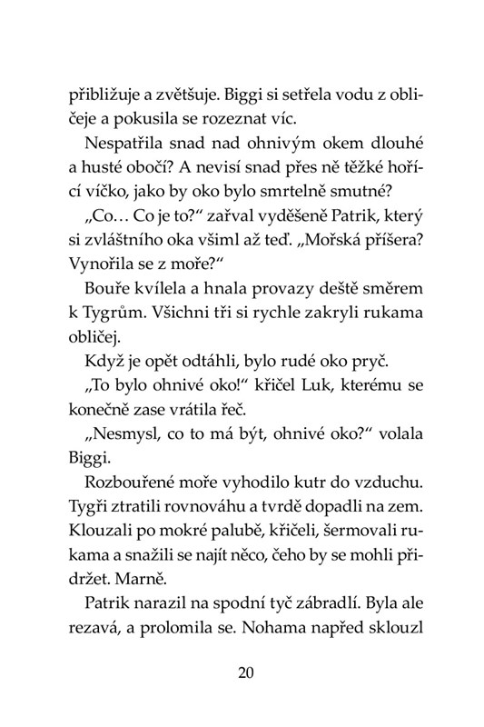 Kamarádi z Klubu Tygrů tráví prázdniny na slunné Havaji. Během plavby za pozorováním velryb je přepadne bouře, v jejímž středu se náhle rozzáří pronikavé rudé oko. Vmžiku se promění v ohnivou kouli a málem jim zapálí loď. Podobný objekt pak Tygři objeví i při výletu do kráteru sopky.To už přece nemůže být náhoda! Přijdou Biggi, Luk a Patrik záhadě na kloub?