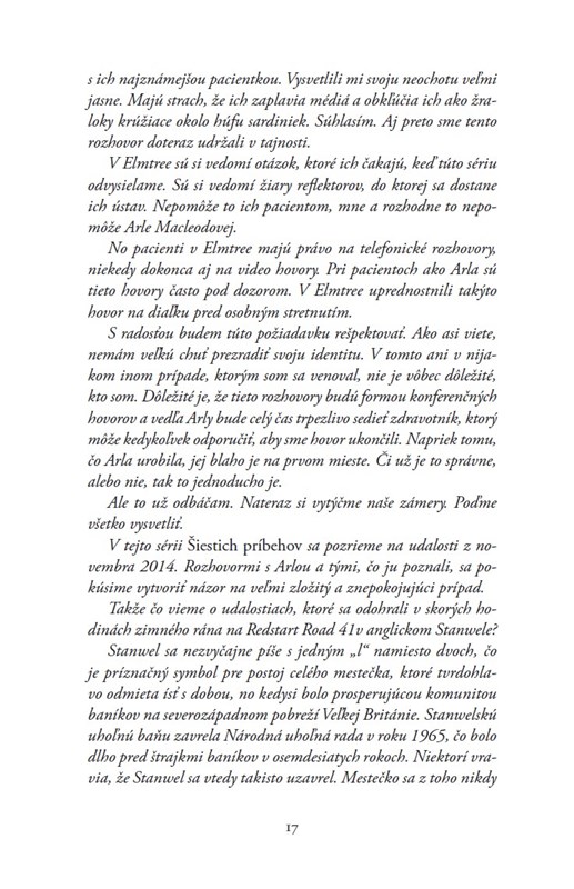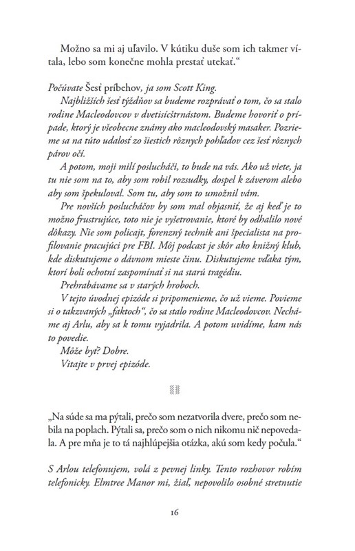 V jednu chladnú novembrovú noc v roku 2014, v malom meste na severozápade Anglicka, dvadsaťjedenročná Arla Macleodová kladivom ubila na smrť svoju matku, otca a mladšiu sestru. Teraz je uväznená v psychiatrickom ústave, odkiaľ poskytne exkluzívny rozhovor Scottovi Kingovi, investigatívnemu žurnalistovi, ktorého podcast Šesť príbehov sa stal internetovou senzá-ciou.
