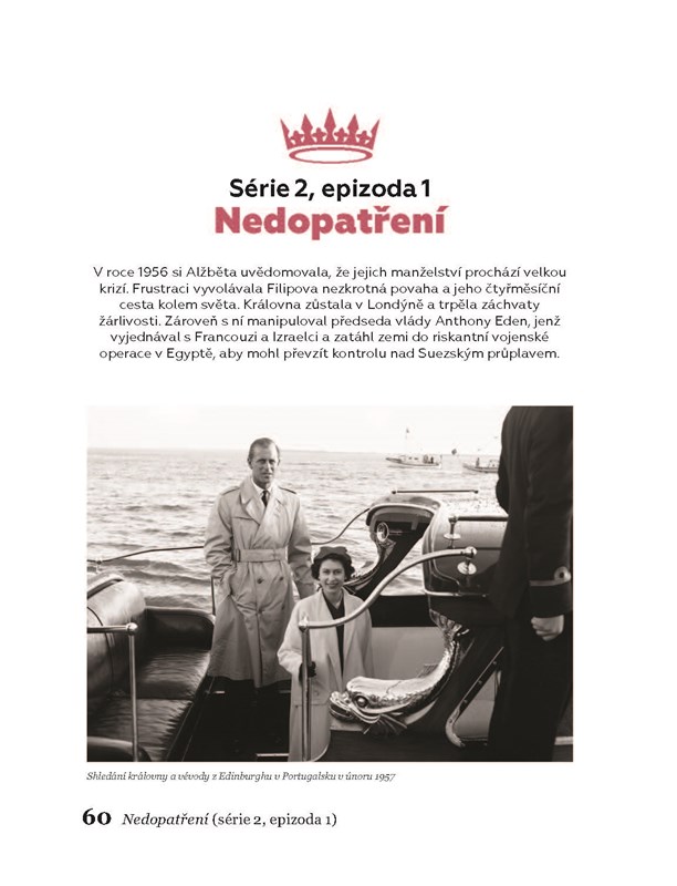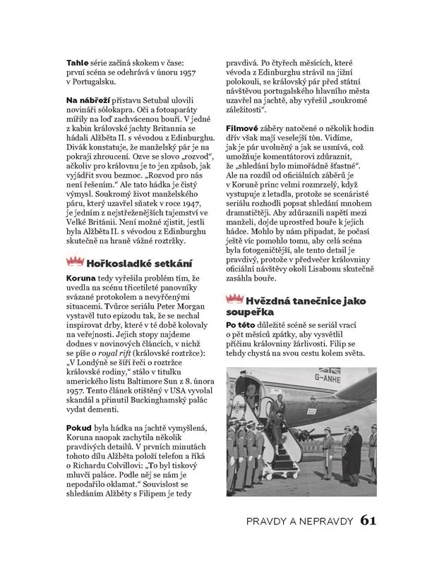 Kniha Koruna - pravdy a nepravdy pomáhá fanouškům seriálu rozeznat fikci od reality. A dělá to nesmírně poutavým způsobem, kdy věnuje každou kapitolu jedné sérii, v níž rozebírá jednotlivé epizody a jejich nejzásadnější momenty. Vše v krásném grafickém provedení, proloženo spoustou dobových fotografií, které autoři často porovnávají se snímky ze seriálu.