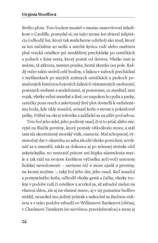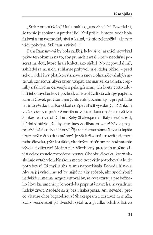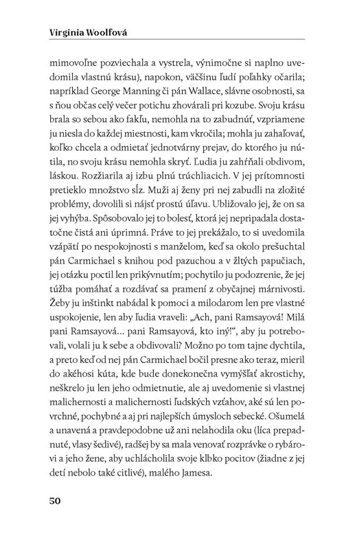 Trocha klasiky. Woolfová píše výnimočne, jej typický 'prúd vedomia' je nielen spoznávaním jej postáv a ich vnútorného sveta, ale pre mňa aj uvedomením si vlastného vedomia, spôsobu premýšľania, často rozháraných myšlienok a prevaľovania protichodných názorov, uvedomovania si všetkého naokolo, aj to, ako hocijaká maličkosť ovplyvňuje inú, ako na nás vplývajú postavy, miesto aj dej naokolo.
