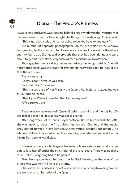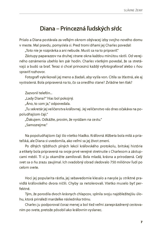 Kniha je určená pre mierne pokročilých študentov angličtiny, ktorí sa radi učia alebo si precvičujú cudzí jazyk čítaním. Slovenský preklad na protiľahlej strane umožní čitateľovi skontrolovať, či cudzojazyčnému textu správne porozumel. Každé rozprávanie o slávnej žene dopĺňajú otázky na porozumenie a tiež zaujímavosť, ktorá sa k hrdinke vzťahuje.
