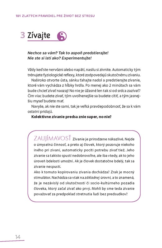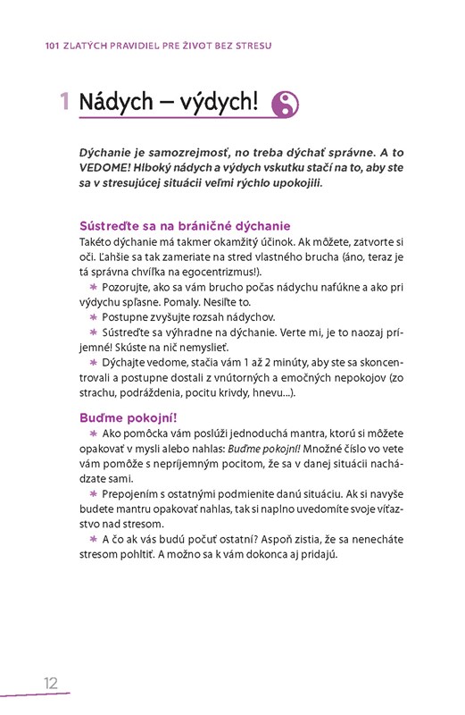 Každý tretí človek je pod stresom. Na prekonanie nepríjemného tlaku, ktorý vo veľkom vzniká ako na pracovisku, tak aj v osobnom živote, je nevyhnutné, vytvoriť si stratégiu, ktorá vám pomôže prepojiť telo a dušu a zdolať vnútorný nepokoj. Týchto 100 + 1 zlatých pravidiel, ktoré sa jednoducho dodržiavajú, vás naučí ako byť kľudnejšími na pracovisku a ako si v každodennom živote udržiavať nadhľad.