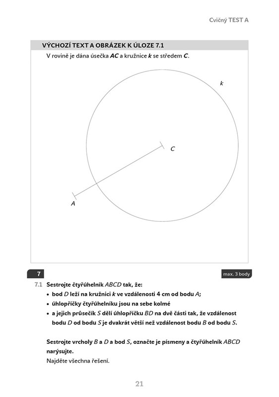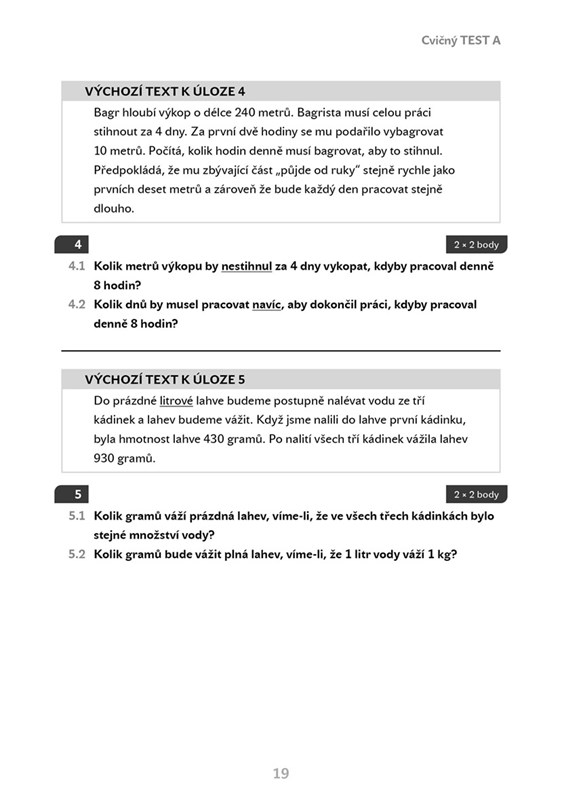 Publikace obsahuje 11 cvičných testů z matematiky. Jsou sestaveny tak, aby žáci získali ucelenou představu o tom, jak jsou otázky formálně koncipovány a uměli se v nich dobře orientovat. Naučí se pracovat s jednotlivými typy úloh a budou si moci vyzkoušet, jak by v testu uspěli. Vyhodnocení správných odpovědí naleznou v klíči správných řešení.