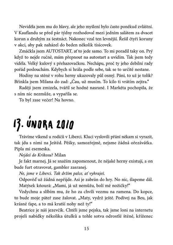 Do Mileny byste to nikdy neřekli. Když po práci vyzvedává svého syna v kostýmku bankovní úřednice nebo když vaří večeři… Přemýšlí přitom jen nad záminkou, jak zmizet z domu. Jak rychle utéct do světa, který ji polapil. Nikdy by vás nenapadlo, že je gamblerka. Ve svém příběhu Milena vypráví, jak se problémy s gamblerstvím stále víc vsakují do rodinného i pracovního života. Jak dlouho se jí podaří utajit svou nebezpečnou vášeň před manželem a přáteli? Kdy si sáhne na úplné finanční i morální dno? A dostane se z toho vůbec?