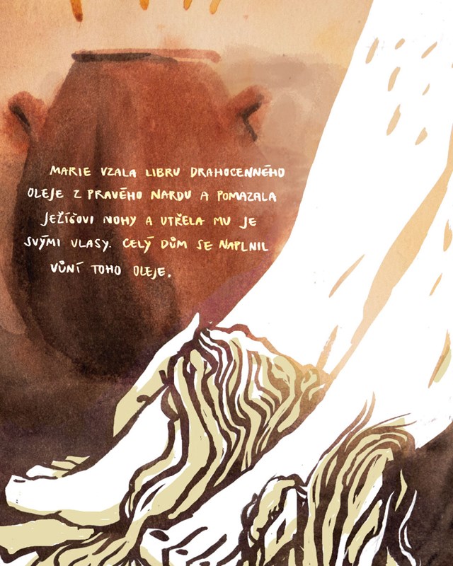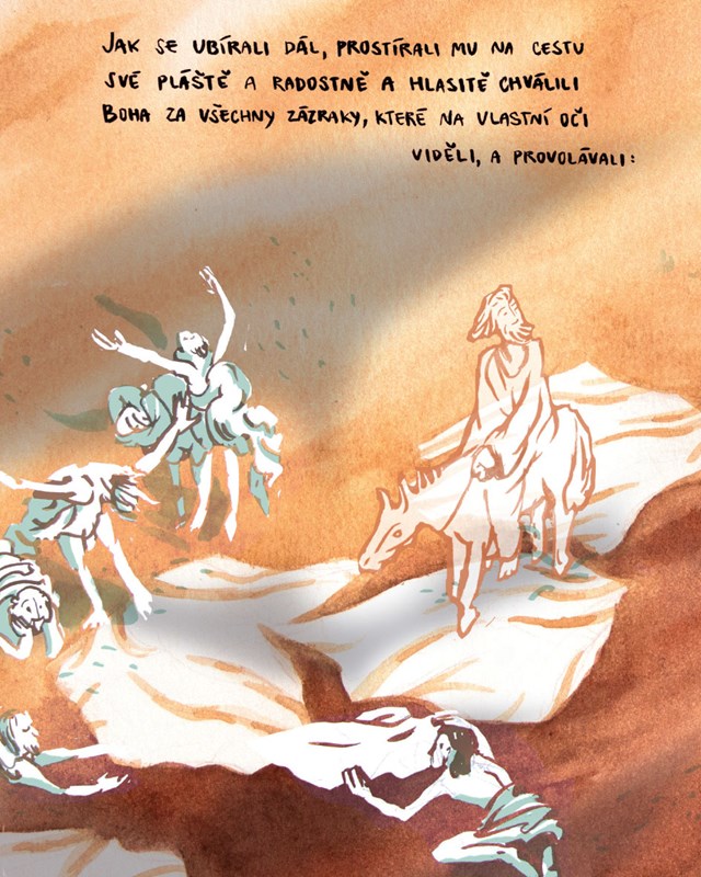 Ježíšova dramatická poslední cesta do Jeruzaléma, během které znělo radostné hosana na výsostech, v ilustracích Terezy Unzeitigové.