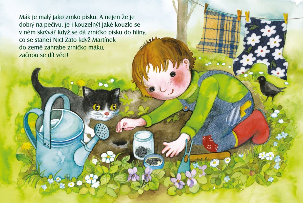 Martínek pomáhá mamince válet těsto na preclíky. Ale než je maminka dá péct, posype je tmavými kuličkami. Copak to je? Máček! Martínek se rozhodl vypátrat, jak takové makové semínko vzniká. Mák je hezká a dobrá rostlinka, a než si pochutnáme na makových koláčích či buchtách, má před sebou hodně práce. Podívejte se!