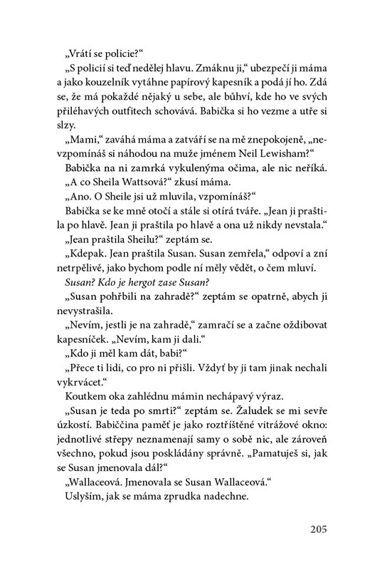 Když se Saffy s Tomem nastěhují do domku na Skelton Place číslo devět a pustí se do stavebních úprav, to poslední, co čekají, je hrůzný nález dvou těl pohřbených na zahradě. Forenzní expertiza ukáže, že tam ležela víc než třicet let. Policie zahájí vyšetřování vraždy a požádá o rozhovor s bývalou majitelkou domku – Saffyinou babičkou Rose. Rose však žije v pečovatelském domě a její paměť je postižena demencí. Spolu se střípky vzpomínek, které se jí chaoticky vynořují, v Saffy narůstá strach spolu s pocitem, že domek i ji někdo sleduje. Co se tam před třiceti lety přihodilo a jakou roli v tom hrála babička? A ocitla se Saffy nyní v nebezpečí?