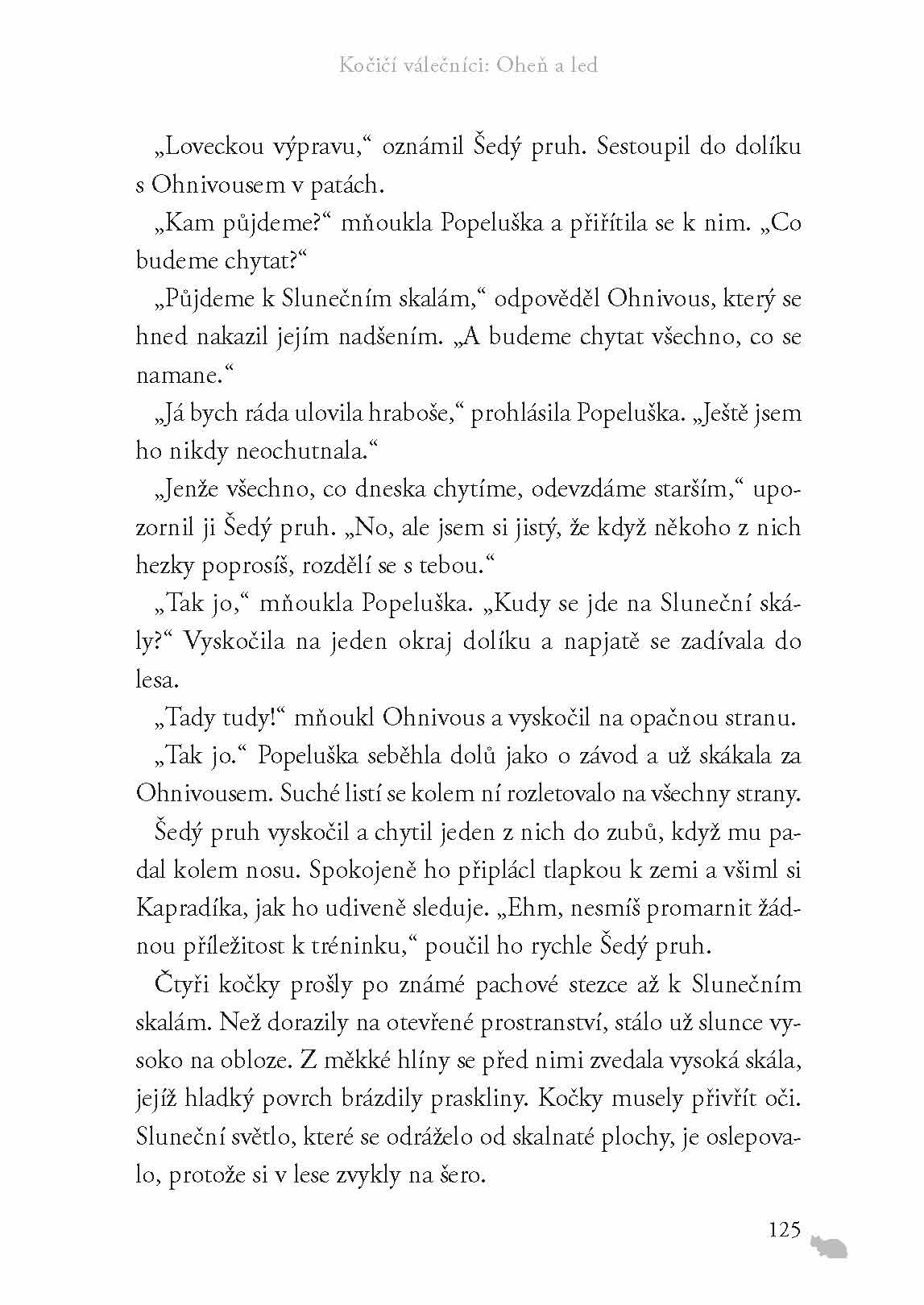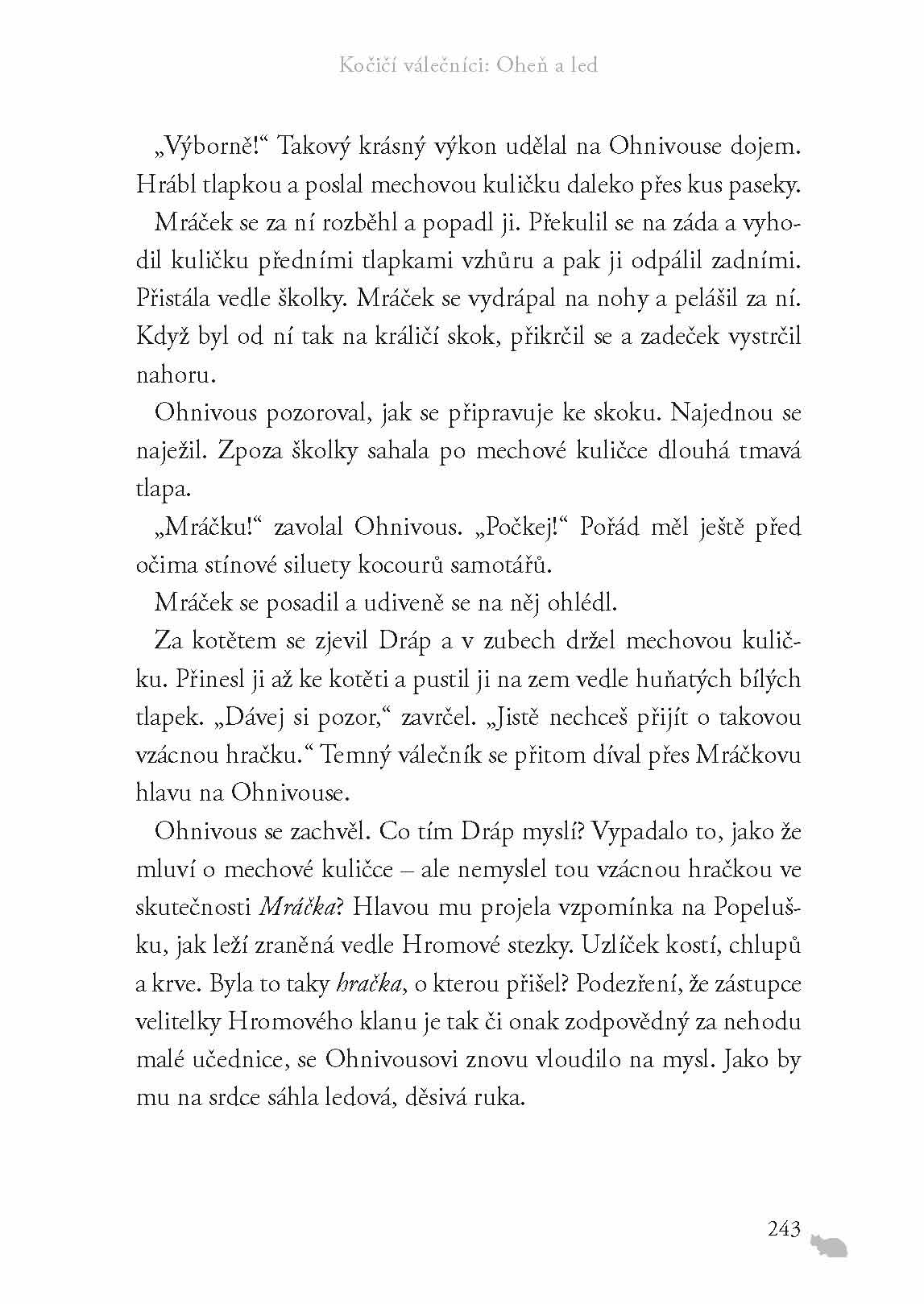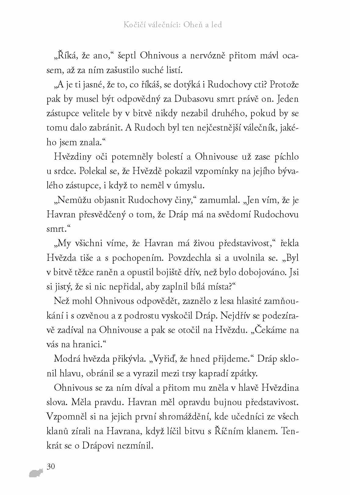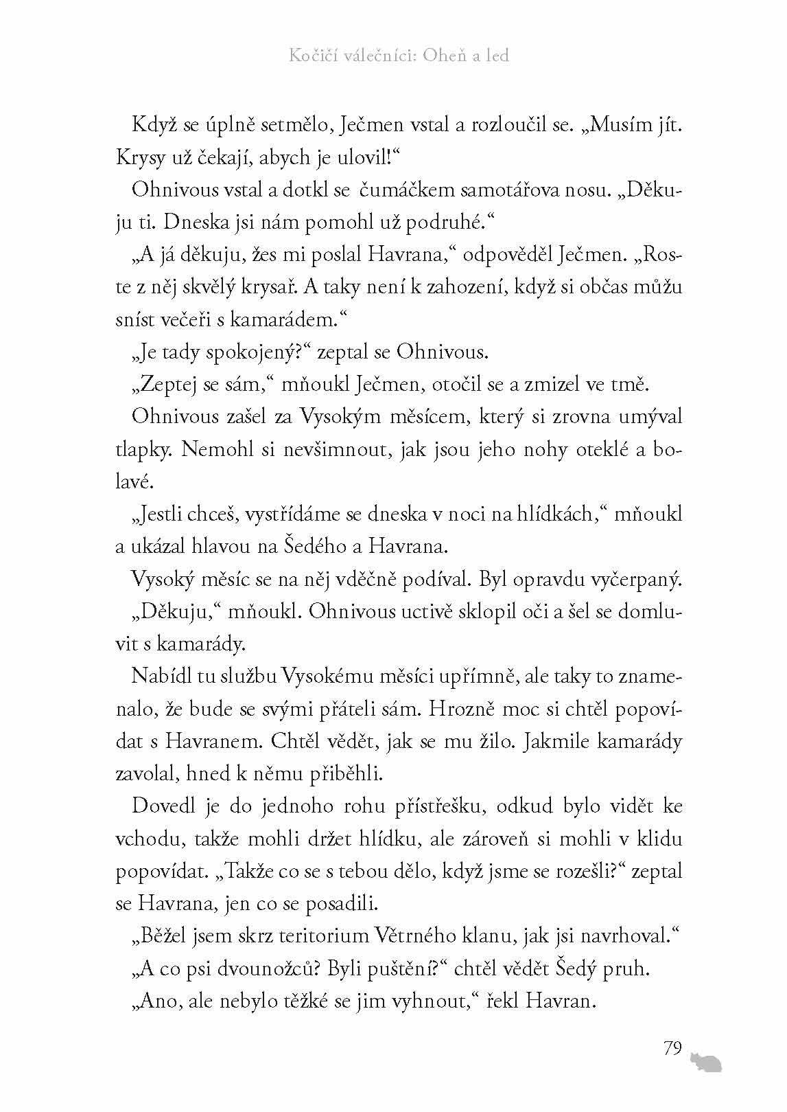 Druhý díl rozsáhlé ságy Kočičí válečníci začíná v době bezlistí. Domácí mazlíček Zrzek dostává nové jméno Ohnivous. Povýšil mezi válečníky, ale respektuje ho velitelka a starší v klanu? Uznání si teprve musí vysloužit! Kočky hladoví a loviště pokryl sníh. Kdo rozhodne bitvu o přežití?