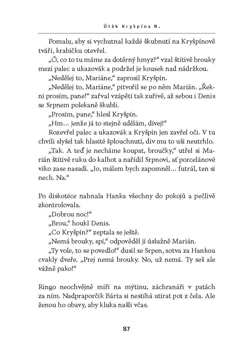Kryšpín je prima, trochu plachý kluk. Kvůli poruše sluchu nosí sluchadla a některé zvuky, které jsou pro zdravého člověka samozřejmé, neslyší. Žije tak v maličko odlišném světě. Do kolektivu Kryšpín moc nezapadá, a tím, že je jiný, spolužáky provokuje. Kluci ze třídy brzy vycítili jeho zranitelnost a ubližují mu. Zpočátku víceméně nevinné útoky se na škole v přírodě změní v opravdovou šikanu. Kryšpín nakonec tlak okolí nevydrží a jedné noci z horské ubytovny uteče…