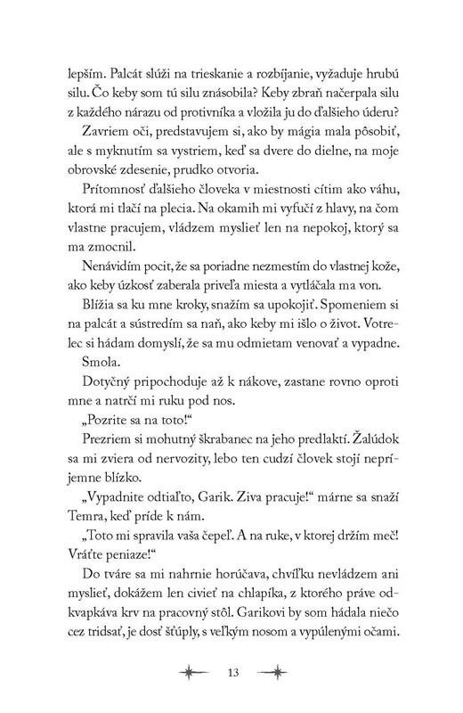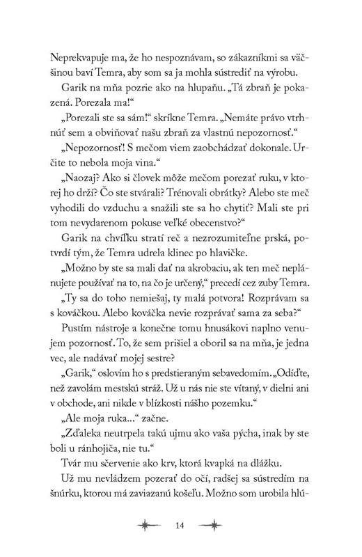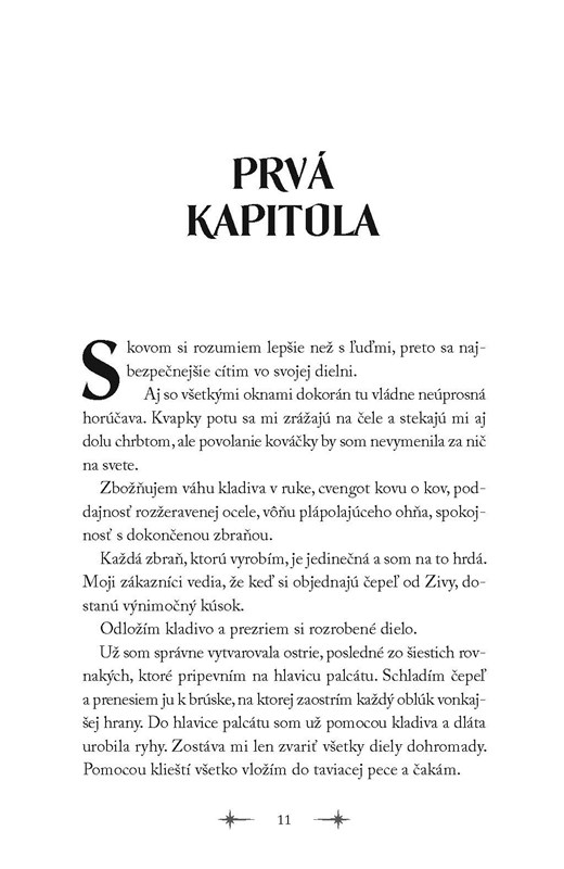 Až keď vyrobí meč, ktorý vyzrádza tajomstvá, opúšťa bezpečie kováčskej dielne. S mečom a so sestrou po boku sa vydáva na šialený útek pred najmocnejšou ženou všetkých kráľovstiev. Vojvodkyňa, pre ktorú meč ukula, si chce totiž podmaniť celý svet a Ziva jej na to vyrobila dokonalý nástroj. Osud dievčat sa prepletie s učencom študujúcim mágiu, no i s rozptyľujúco krásnym žoldnierom Kellynom. Zive sa pri pohľade naňho prvýkrát podlomia kolená a snaží sa s tým stoj čo stoj bojovať. Jeho ohnivým vlasom a mocným ramenám však napokon nenávratne podľahne. Cíti to Kellyn rovnako alebo po jej boku zostáva len pre sľúbenú odmenu?