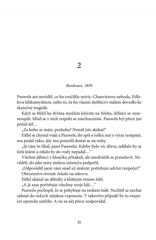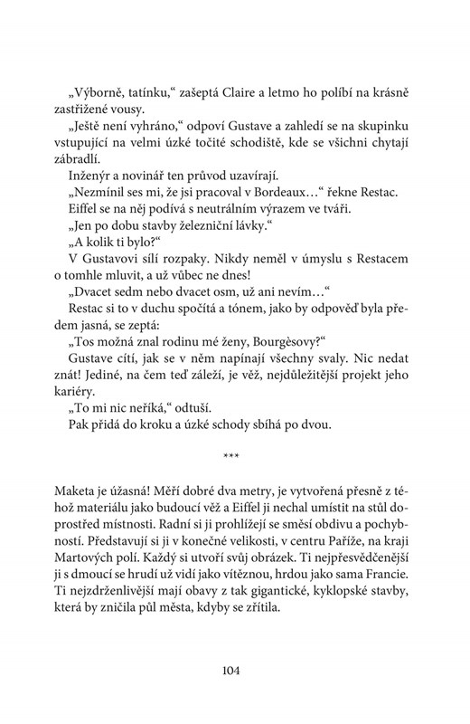 Za světoznámou ikonickou stavbou se skrývá příběh životního triumfu, z nějž vzešla zrada i osudová láska. Píše se rok 1886, blíží se Světová výstava a Gustave Eiffel má francouzskou metropoli ohromit dosud nevídaným monumentem. Je to však jediný důvod, který „básníka železa“ žene k neúnavnému rýsování plánů a hledání dokonalého tvaru? Když na večeři u ministra obchodu potká dávnou lásku Adrienne, jako by se tato femme fatale vtělila i do jeho životního projektu. K pařížskému nebi se už navždy bude tyčit ladná křivka třísetmetrové „krásky“.