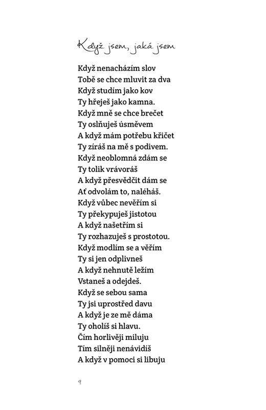 Sbírka 33 básní o radostech i strastech. O lásce v jejích mnoha podobách, rodině a dětech. O domácím násilí, ale i dotecích plných vášně a něhy. O životě takovém, jaký je.