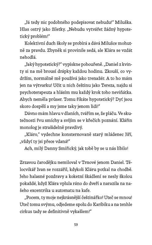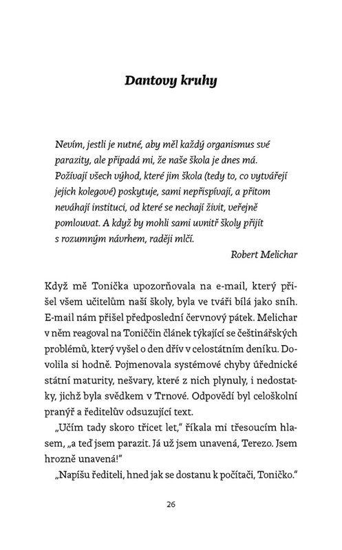 Silný příběh o profesních i osobních strastech jedné češtinářky je inspirovaný mnohaletým působením spisovatelky Veroniky Valíkové na několika gymnáziích. Situace, do nichž se dostává hlavní hrdinka, jsou absurdní, tragické i komické. Autorka líčí život učitelky, manželky i matky ve všech jeho podobách.