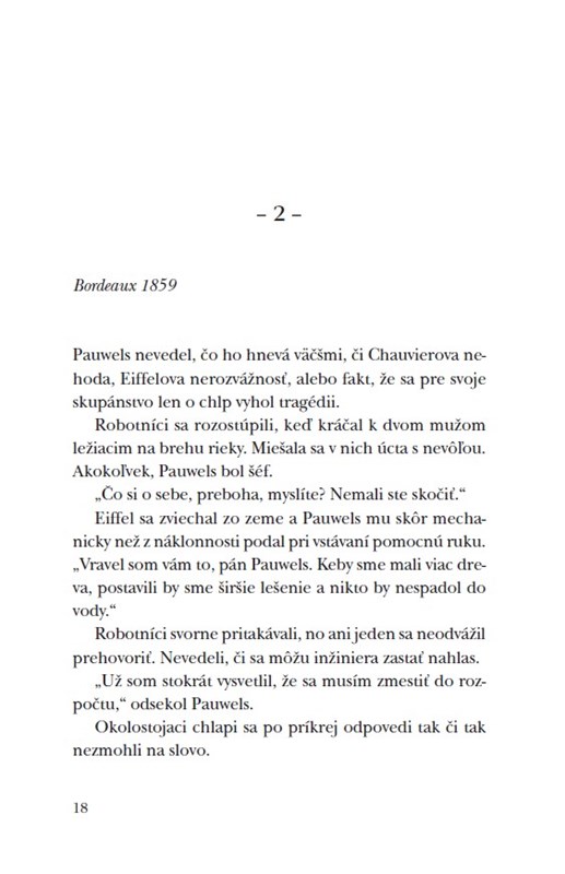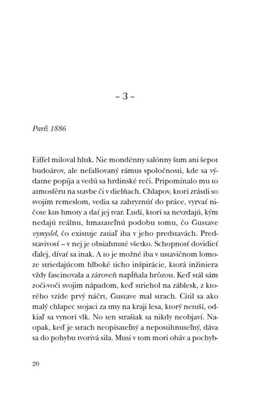 Gustava Eiffel pozná snáď každý nielen vďaka pre Paríž a celé Francúzsko tak ikonickej Eiffelovej veži. Nicolas d’Estienne d’Orves v románe venovanému tomuto geniálnemu inžinierovi a umelcovi odkrýva aj jeho lásku a ženu, ktorá ho v mnohom inšpirovala.