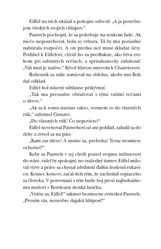 Eiffel je nádherným príbehom nielen o láske a zrade. Zamilovala som sa od prvých strán do francúzskeho prostredia, postáv a tiež autorovho štýlu písania. Celý román bol napísaný s istou ľahkosťou a príbeh som prečítala doslova na jeden nádych. Vzťah medzi Gustaveom a Adrienne bol nádherný, no veľmi krehký a krátky. O to viac som im fandila pri opätovných stretnutiach.