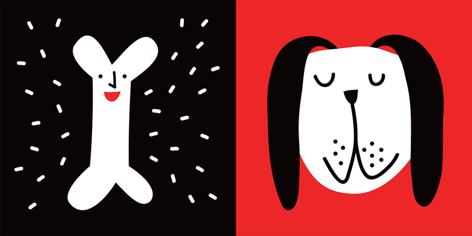 Leporelo pro nejmenší plné ostře kontrastních obrázků. Miminka ráda pozorují tváře, a tak se tu na ně usmívá banán a psí kost.