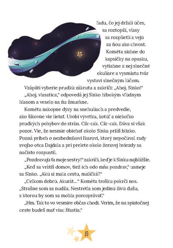 Malá kométka letí vesmírom na svoju pravidelnú návštevu k Slnku. Aby sa cestou domov nenudila, rozhodne sa navštíviť planéty slnečnej sústavy. A tak sa kométka zoznámi s krásnou Venušou, láskavou Zemou, bojovným Marsom, nafúkaným Jupiterom, učeným Saturnom a ďalšími planétami, ktoré jej rozpovedia svoj príbeh.