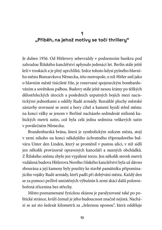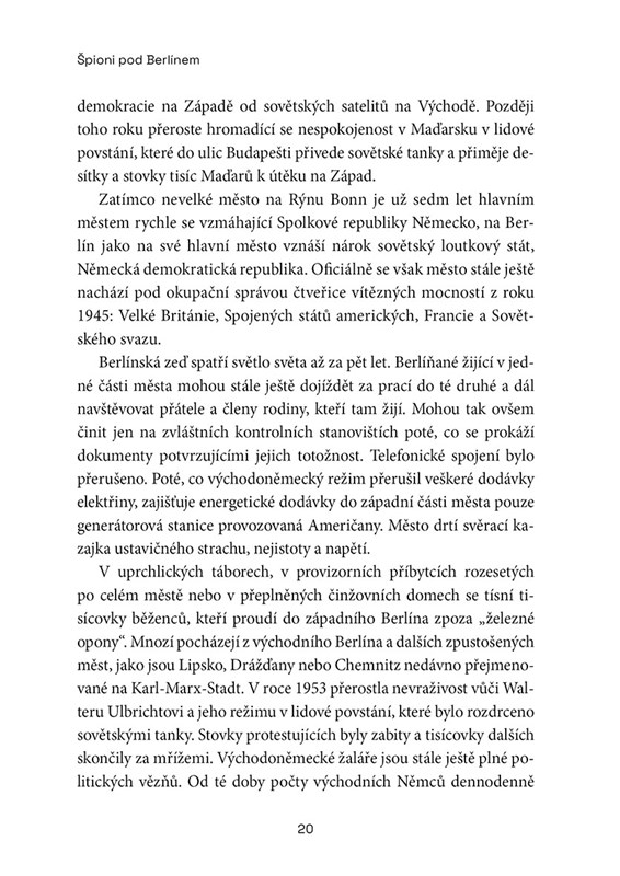 Avšak to ještě netušili, že se v britských tajných službách skrývá sovětský špion, který plány na vyhloubení tunelu vyzradil KGB ještě před jeho vybudováním... Špioni pod Berlínem vám představí nejen hlavní aktéry berlínské špionážní akce, ale i tehdejší napjaté geopolitické prostředí. Kniha čerpá z rozhovorů s očitými svědky a z celé řady odtajněných historických pramenů. Kniha mimo jiné hledá odpovědi na otázku: Proč KGB neinformovala o tunelu Rudou armádu? Stála za tím snad rivalita mezi tajnými službami? Nebo byl britský špion tak cenný, že KGB raději obětovala tajemství Rudé armády, než aby ho ohrozila?