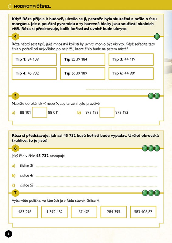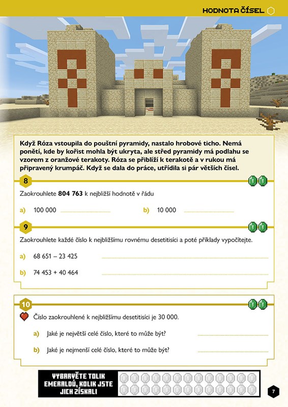 Vyřešte matematické úlohy a pomozte tím hrdinům ze světa Minecraftu na jejich misích. Čekají vás číselné řady, klasické početní příklady, zlomky, míry i geometrie a statistika. Prozkoumejte v každém tématu různé biomy, získejte během procházení knihou emeraldy a zvolte si, jak s nimi naložíte.
