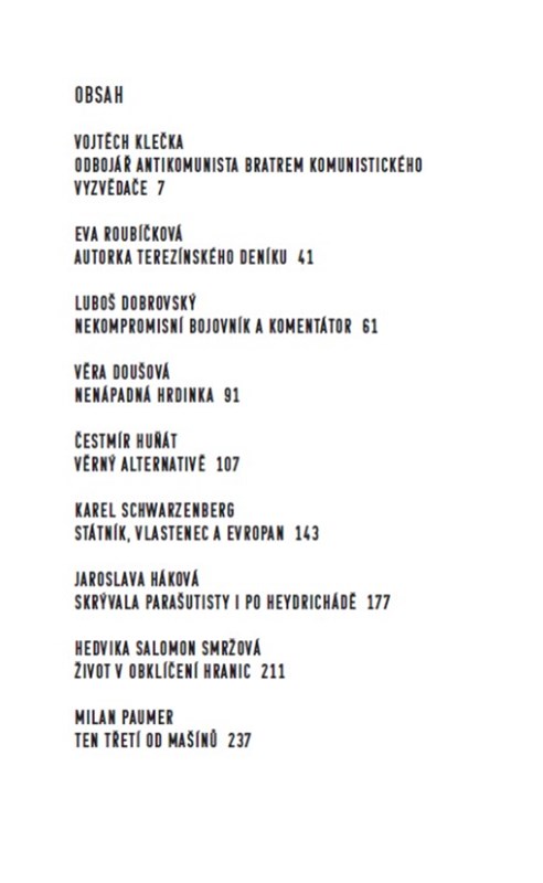 Rodina Jaroslavy Hákové se nebála ani po heydrichiádě ukrývat parašutisty vyslané z Anglie, paní Háková se osobně setkala i s pověstným zrádcem Karlem Čurdou a její svědectví dokumentuje fakta o výsadcích československých parašutistů z Anglie v době Protektorátu. Doslova fascinující je životní příběh Vojtěcha Klečky, agenta-chodce, politického vězně antikomunisty, jehož bratr byl odhaleným komunistickým agentem. Životní pouť nenápadné hrdinky Hedviky Salomon Smržové v sobě snoubí zkušenost příslušníků a potomků národností menšiny a též vypovídá o krutosti potlačování církví a církevních společenství v neúprosných padesátých letech. Milan Paumer „ten třetí od Mašínů“ svou autentickou výpovědí dokresluje snad nejznámější příběh studené války za železnou oponou. Poznejte dějiny skrze příběhy!