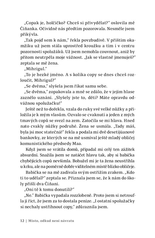 Lidskoprávní organizace a vlády po celém světě hovoří o zločinu proti lidskosti, o „kulturní genocidě“. Jednou z obětí čínských snah o totální asimilaci ujgurské menšiny se stala i Mihrigül Tursunová. Prošla si takzvanými převýchovnými tábory, ve kterých na vlastní kůži zažila nepopsatelné hrůzy, od psychického teroru až po fyzické násilí. Během jejího pobytu za mřížemi navíc zemřel, za dosud nevyjasněných okolností, jeden z jejích synů. Přestože také v exilu čelí výhrůžkám, našla v sobě odvahu otevřeně promluvit o tom, co prožila, a na základě vlastní zkušenosti popsat, co všechno musí Ujguři v Číně snášet. Její důležité očité svědectví přibližuje čtenářům osudy lidí, které jinak zůstávají skryty za zprávami z daleké Číny.