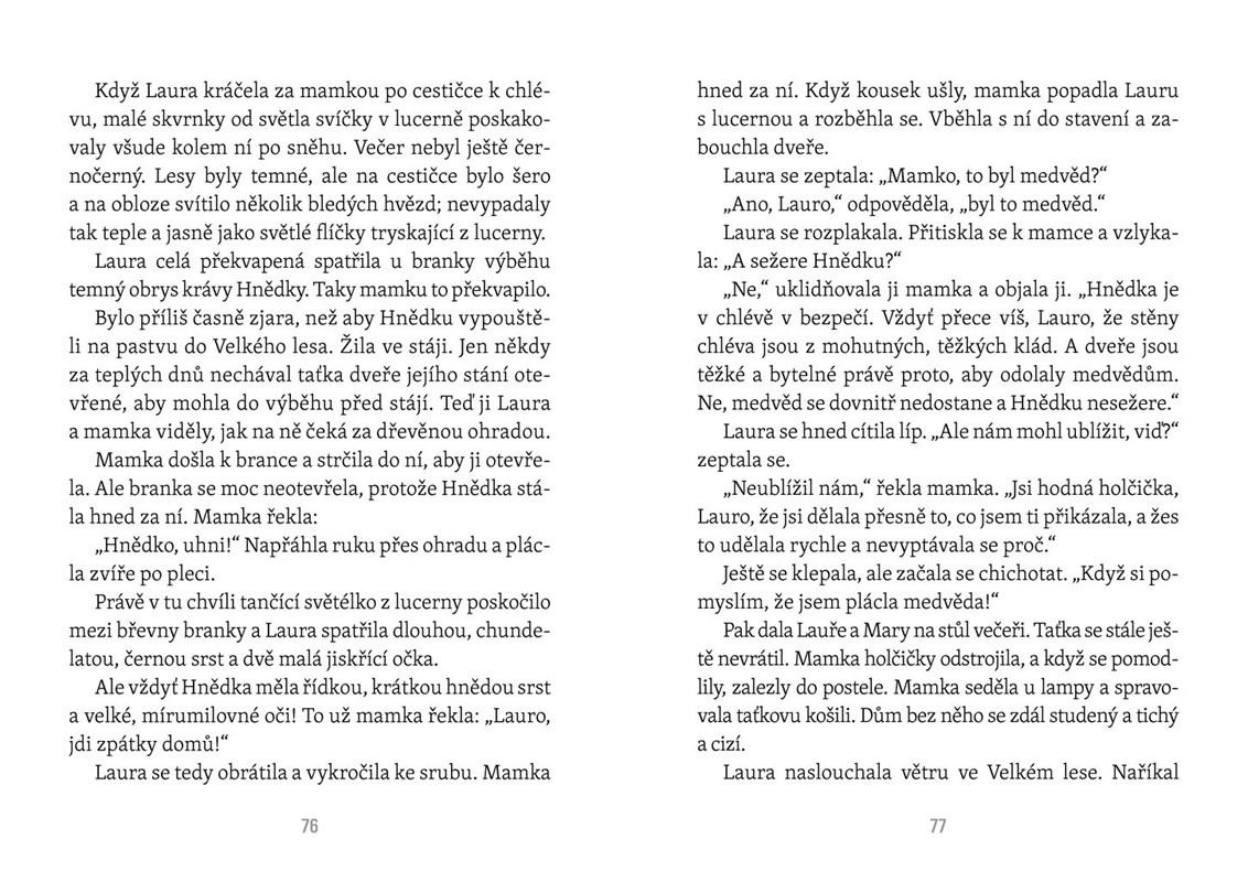 Píše se rok 1871 a osidlování Ameriky je v plném proudu. Laura bydlí spolu s rodiči a dvěma sestřičkami uprostřed wisconsinské divočiny. Do nejbližšího města je to na koni půl dne cesty, to ale Lauře vůbec nevadí – život v lese plném medvědů, pum a vlků je přece úžasné dobrodružství. A když tatínek vytáhne housle a zahraje, to je veselo! Klasické vyprávění neopakovatelným způsobem ukazuje krásné dětství v krásné přírodě se vším, co k tomu patří.