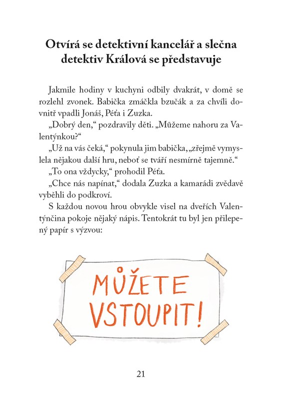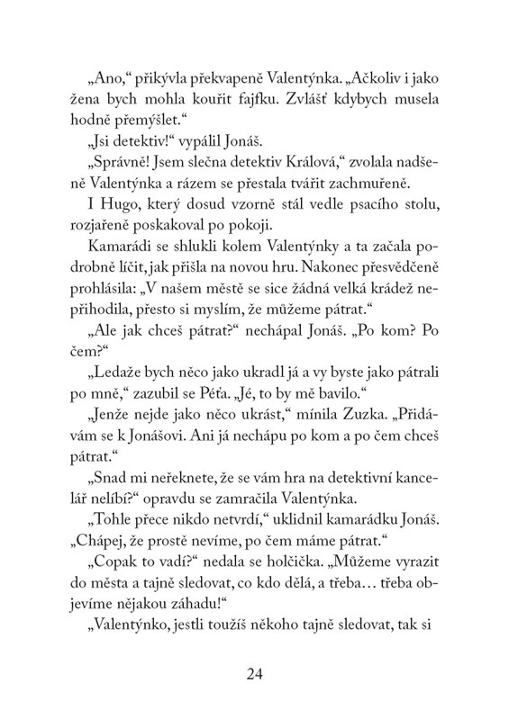 Nápad na novou hru pro kamarády Jonáše, Péťu a Zuzku tentokrát vnukne Valentýnce tatínek. Četl v novinách o krádeži soch andělů v nedalekém kostele. A tak se Valentýnka rozhodla, že založí detektivní kancelář. Děti se nadšeně vypraví na náměstí v naději, že spatří něco podezřelého. Co tamhleten protivný zmrzlinář? A podívejme, kam najednou zmizel, vozík zůstal opuštěný. Pátrání může začít!