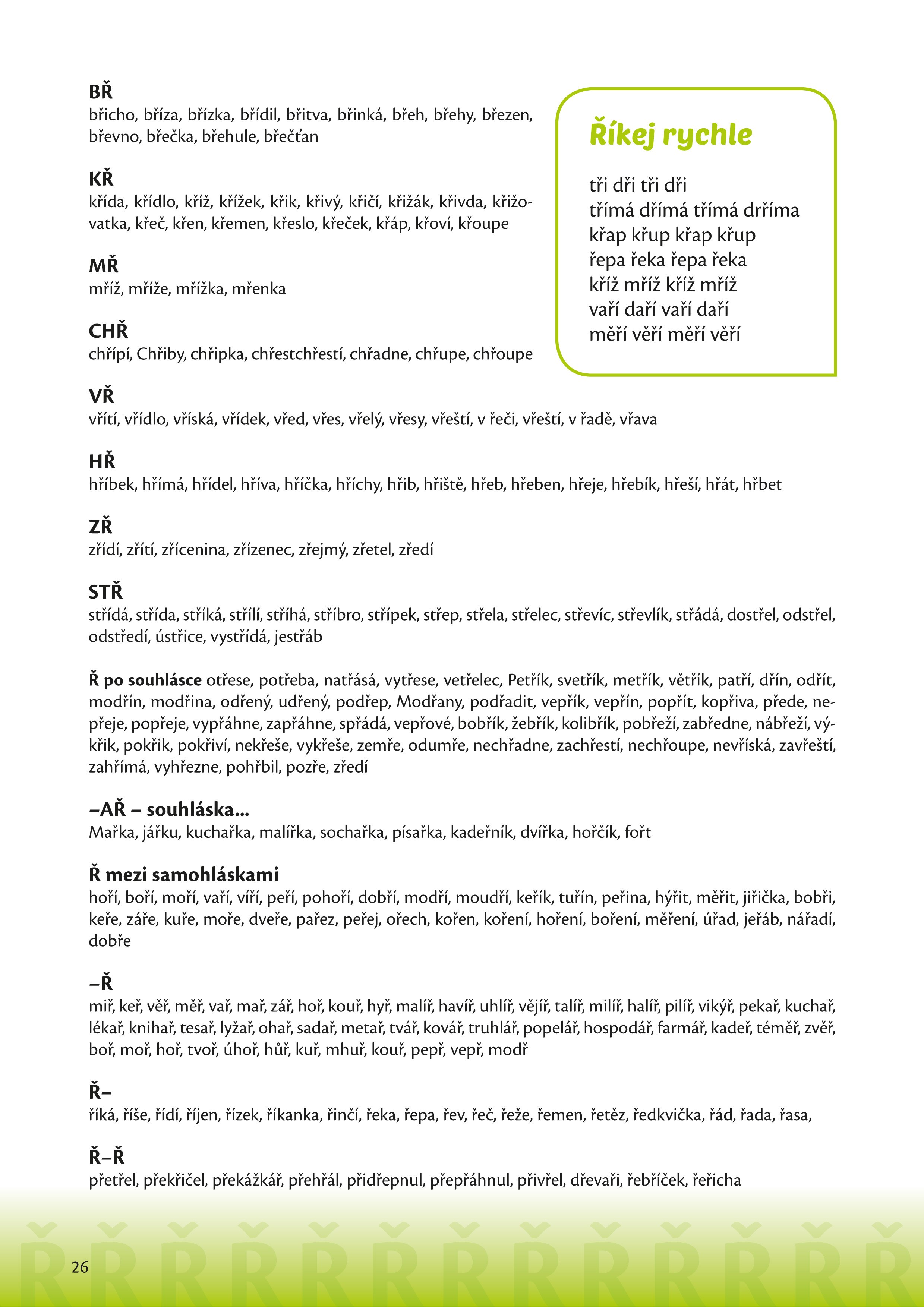 Publikace Naučte své děti říkat L, R, Ř je určena především rodičům pro domácí procvičování problematických hlásek, ale i odborníkům z řad logopedů, speciálních pedagogů či učitelům v mateřských školách. Autorka Irena Šáchová, která čerpá ze své dlouholeté praxe klinické logopedky, uvádí ke každé hlásce přehledný a jasný návod, jak při jejím vyvození správně postupovat, a upozorňuje i na častá úskalí při procvičování. Pokynům snadno porozumí rodiče i děti, které knihou provází sympatická postavička logopedky Lucky. Úkoly a cvičení doplňují veselé obrázky Evy Obůrkové. Oblíbené popletené celostránkové obrázky si děti mohou vybarvit. Atraktivní příloha nabízí pět her ke zdokonalení výslovnosti a zpestření procvičování hlásek L, R, Ř – loto, pexeso a domino.