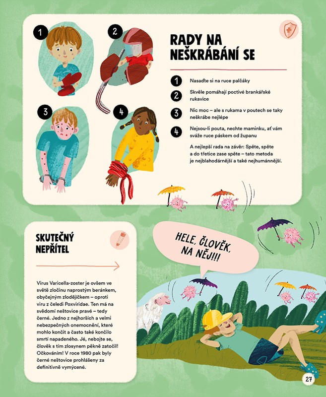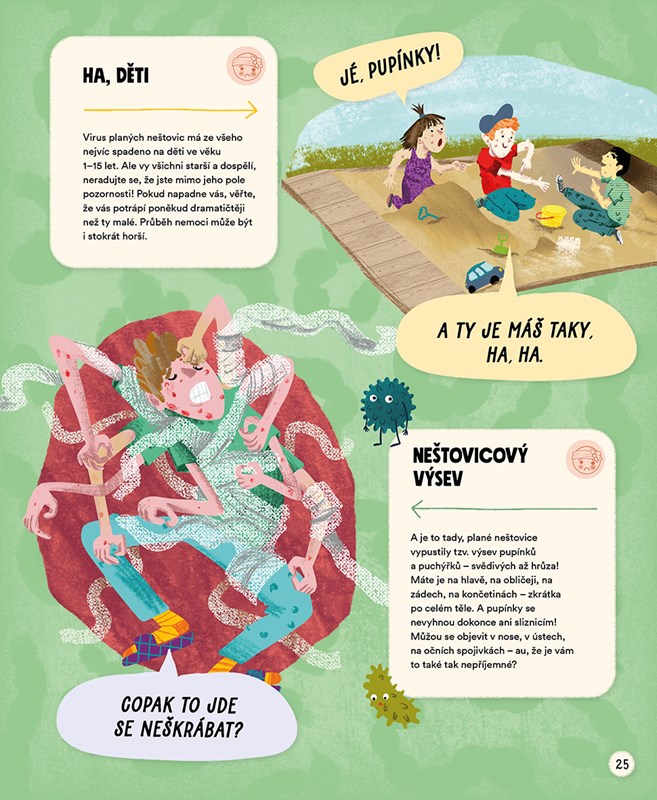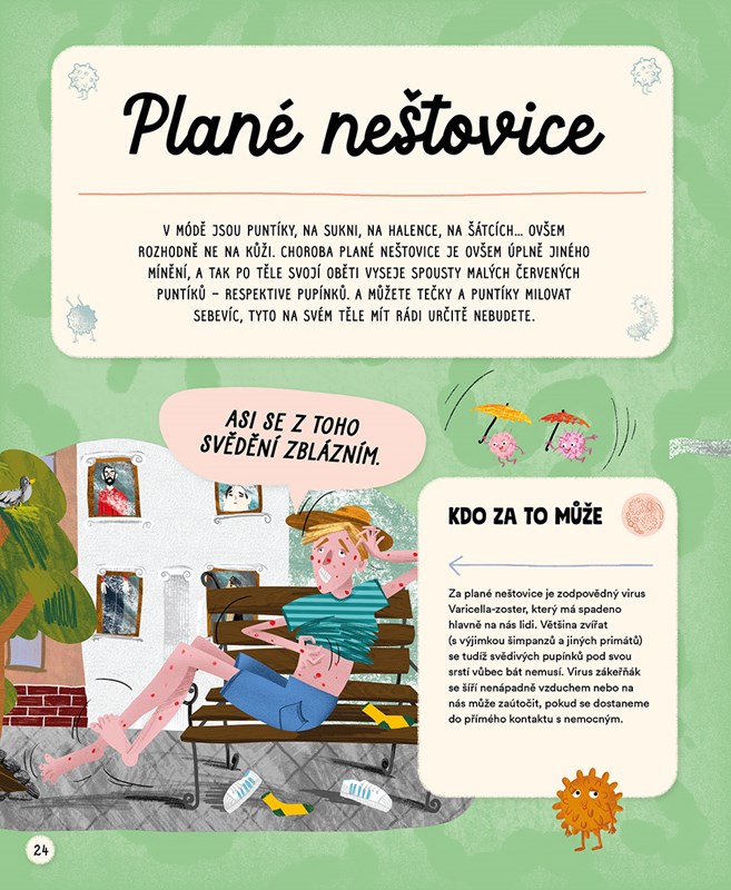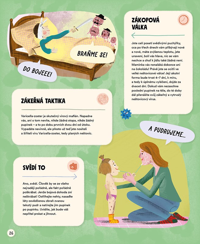 Chceš se stát doktorkou nebo doktorem? Pak ti určitě přijde vhod kniha plná těch nejotravnějších nemocí... a chytrých, ale také zábavných rad, jak na ně. Kamarád se trápí s rýmou? Babička má bradavice? Brácha zas při kašlání poprskal všechny okolo a ty sám máš tak jako každé pondělí lehký břichabol...? Ať už chceš pomáhat lidem kolem sebe, nebo tě jenom zajímá, kdo je to ten záhadný otolaryngolog, přečti si tuhle knížku. Dozvíš se v ní nejenom to, že existují hned tři různé druhy rýmy, ale i to, jak se od sebe liší úpal s úžehem anebo jak se neuškrábat k smrti, když už konečně chytneš ty proslulé plané neštovice, o kterých všichni kolem mluví. Rozhodně ti slibujeme, že se při seznamování se všemi možnými duhy i neduhy nebudeš nudit ani vteřinu!
