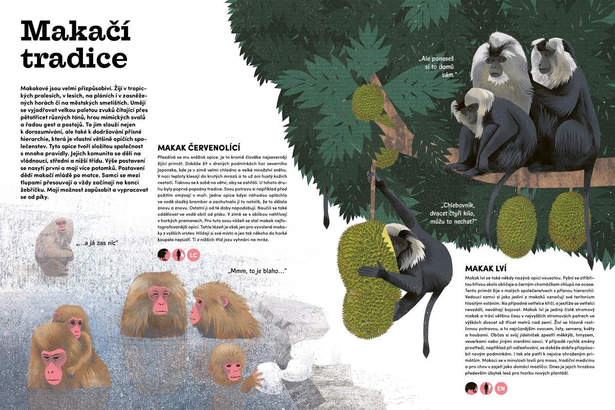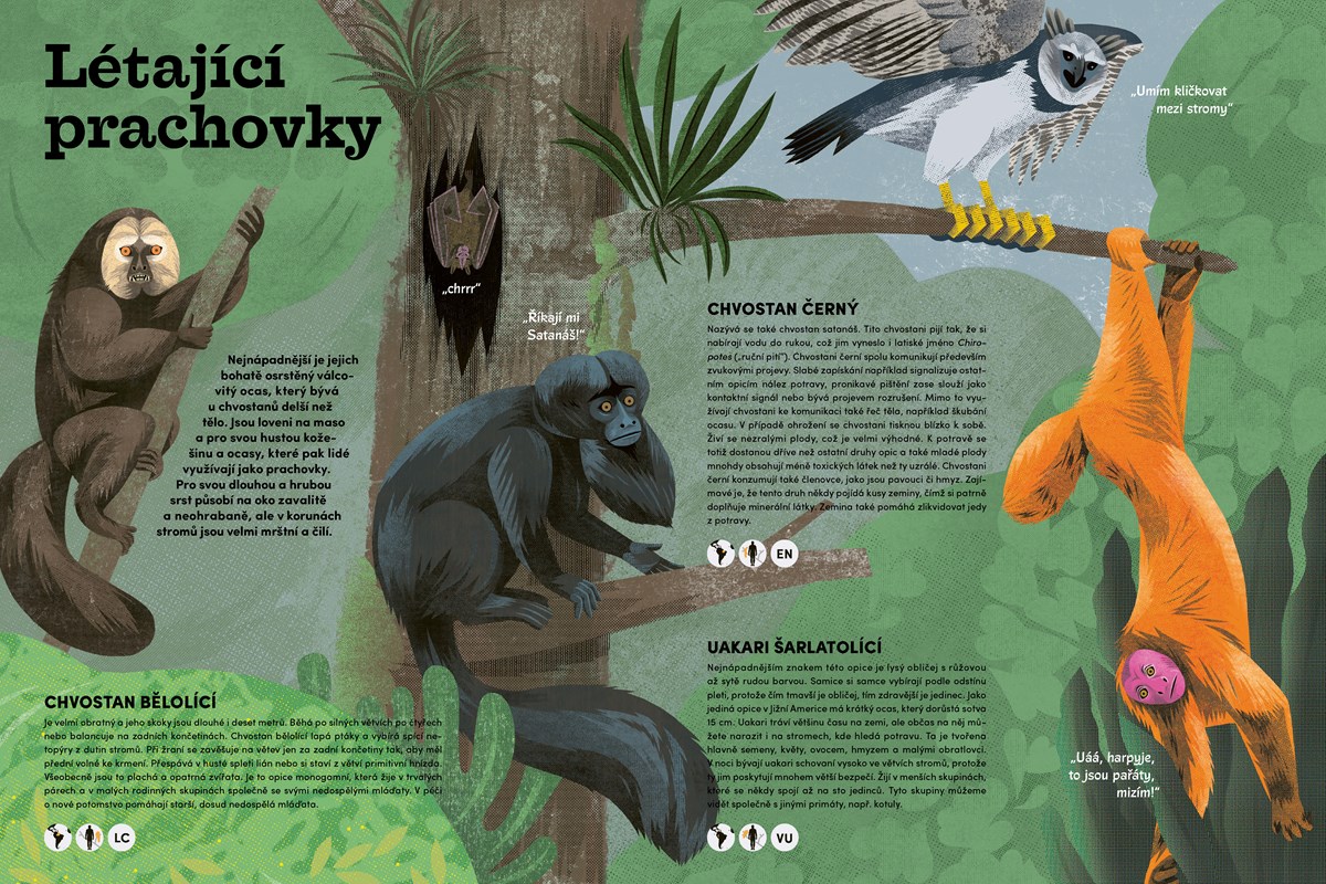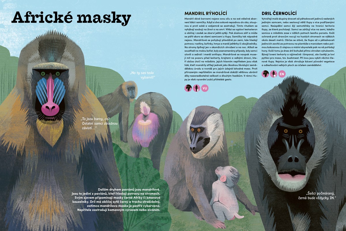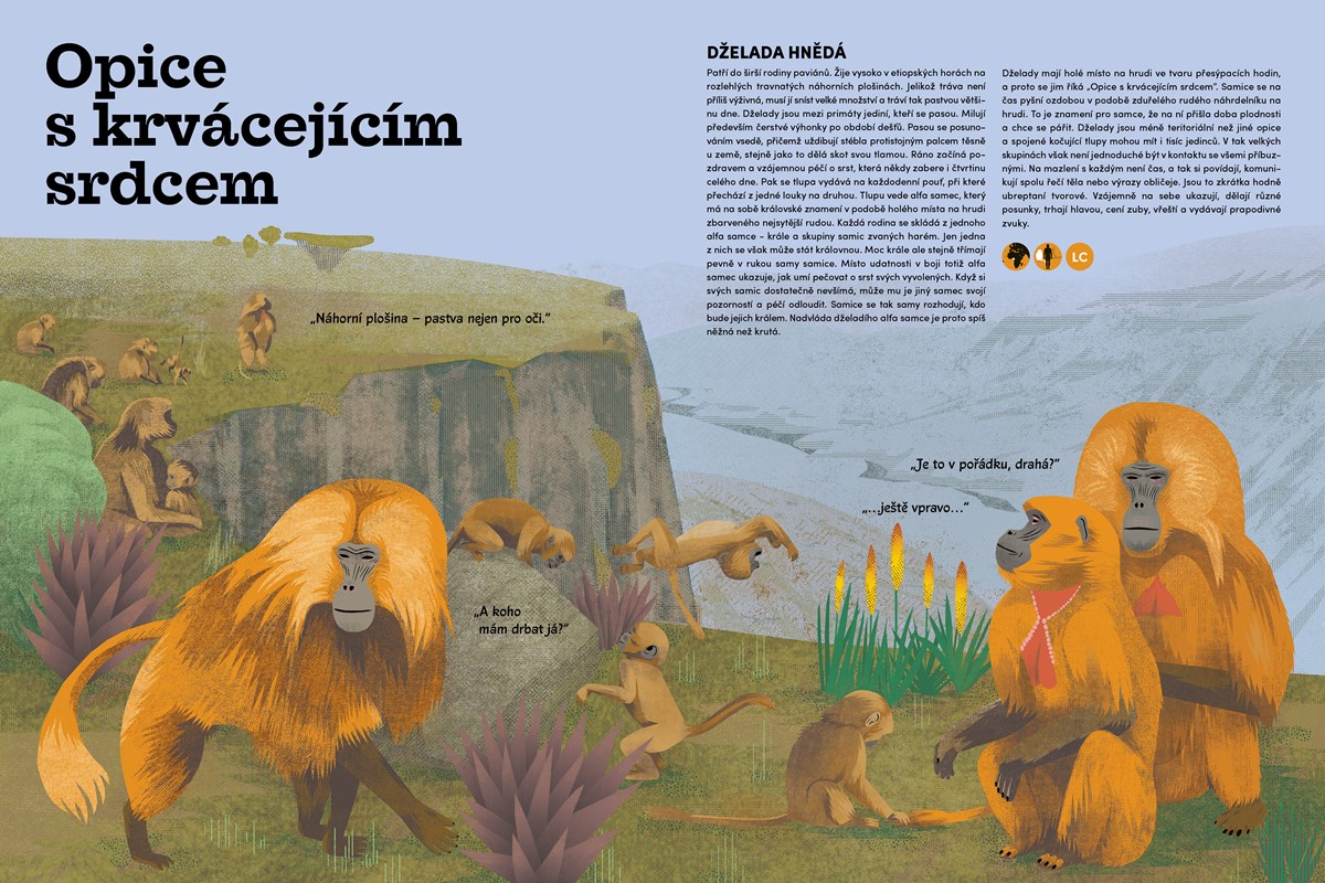 Rodinu opic, vědecky řečeno řád primátů, tvoří stovky zvláštních, všemi barvami hrajících druhů rozšířených po celém světě. V této velkoryse ilustrované knize je najdete přehledně seřazeny. Dozvíte se třeba, které opice jsou vzhůru raději v noci než ve dne, kdo má namísto čtyř pět rukou, kdo se skrývá za maskou, které opice létají nebo která opice se dostala až za oběžnou dráhu Země. Budete moci srovnat rekordmany opičí říše a poznáte vědce, kteří zkoumání inteligentního světa primátů zasvětili celý život. U každé opice také najdete, kde druh žije, jak je velký v porovnání s člověkem i nakolik je ohrožený.