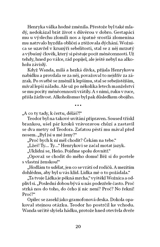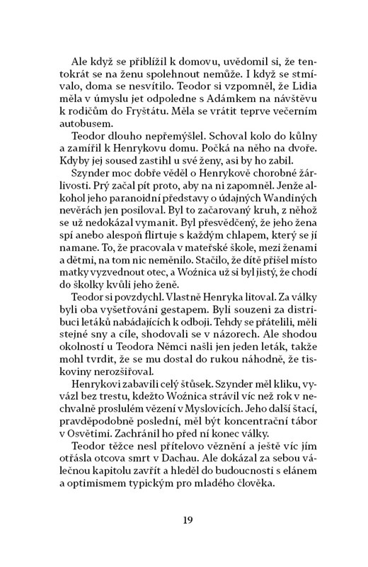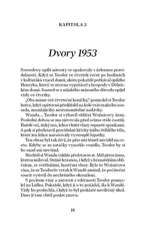 Další román česko-polské autorky Danuty Chlupové se odehrává v padesátých a šedesátých letech na Karvinsku. Teodor je venkovský učitel a varhaník, jehož milostný příběh se osudově prolne s politickým děním, a Teodor se stane obětí zmanipulovaného soudního procesu. Přestože je nakonec propuštěn, jen obtížně navazuje zpřetrhané vztahy s rodinou a okolím. Autorka bestselleru Jizva opět dovedně splétá příběhy obyvatel vesnice, jejíž budoucnost je podobně nejistá jako osudy těch, kdo v ní žijí.