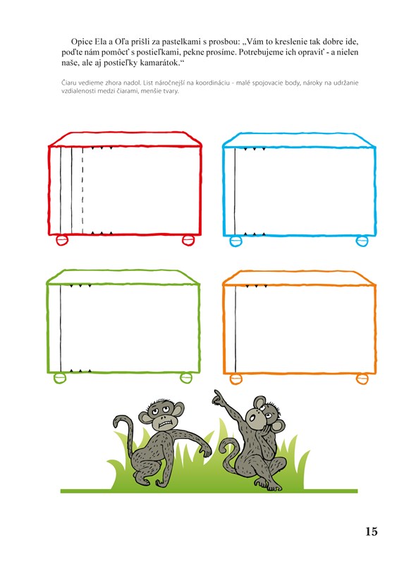 Prečo sa zaoberať grafomotorikou, ktorá sa týka najmä písania? Aby sme sa dozvedeli, ako je to s kresbou a písaním, ako sa táto časť jemnej motoriky a tiež psychické funkcie potrebné pri kreslení a písaní vyvíjajú, kedy by sme mali uvažovať o tom, že naše dieťa potrebuje nejakú podporu. Prečítame si najprv list, ktorý dospelým napísala autorka námetu a?celého súboru cvičení obsiahnutých v knižke. Jiřina Bednářová zúročila odborné poznatky a svoje dlhoročné praktické skúsenosti z práce s deťmi predškolského veku aj s malými školákmi. Jej odporúčania, týkajúce sa nielen zásad pri práci s touto knihou, ale aj činností rozvíjajúcich jemnú motoriku, ľaváctvo a praváctvo, pracovných návykov pri kreslení, teda aj správneho držania písacieho náčinia a jeho voľby, určite pomôžu spoznať, čo ktoré dieťa potrebuje. Aby cvičenie - kreslenie prebiehalo, ako má, pretože dodržanie metodického postupu má význam pre dosiahnutie dobrého výsledku. Pri každom cviku sú zvýraznené odporúčania, ako správne metodicky postupovať. Keď sa na prácu dobre pripravíme, budeme sa spolu s naším malým kresliarom tešiť so Šmardovými pastelkami Boženkou a Majou a s veselými zvieratkami. Nakoniec si overíme, čo sa náš chlapec či dievčatko a pastelka Maja naučili, a zistíme, že sa nikto z nich nemusí schovávať v kútiku, pretože už vie kresliť a?kreslí rád. V škole mu tak dobre pôjde nielen kreslenie, ale aj písanie.