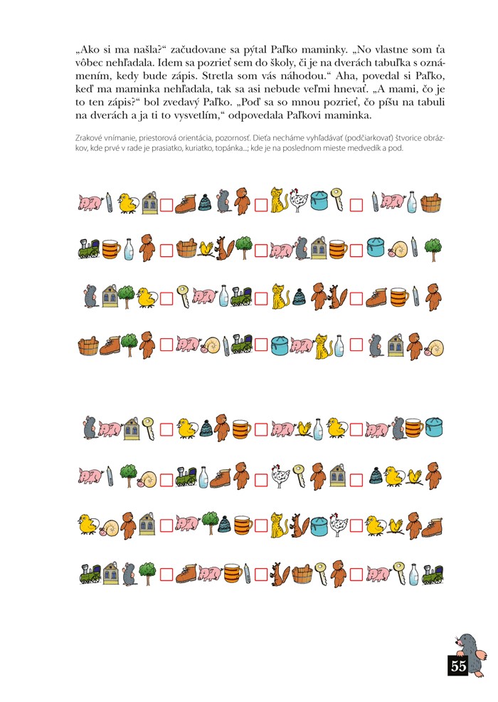 Publikácia je určená na preverenie znalostí, schopností a zručností detí pred nástupom do školy. Najvhodnejšia je pre deti vo veku 5 až 7 rokov. Kniha obsahuje úlohy potrebné pre rozvoj čítania, písania, počítania a zameriava sa na oblasť grafomotoriky, zrakového vnímania, reči, sluchového vnímania, priestorovej a pravo – ľavej orientácie, vnímanie času a základných materiálnych predstáv. Úlohy z jednotlivých oblastí sa pravidelne striedajú, sú zoradené od jednoduchších po tie najťažšie. Každá strana obsahuje motivačný príbeh pre deti, vysvetlenie činnosti a jej cieľa pre dospelých, ilustrovanú úlohu pre deti a záverečnú dvojstranu informácií pre dospelých.