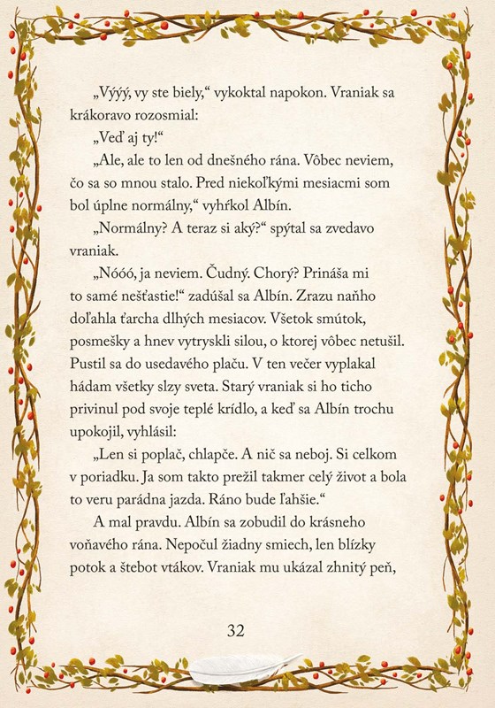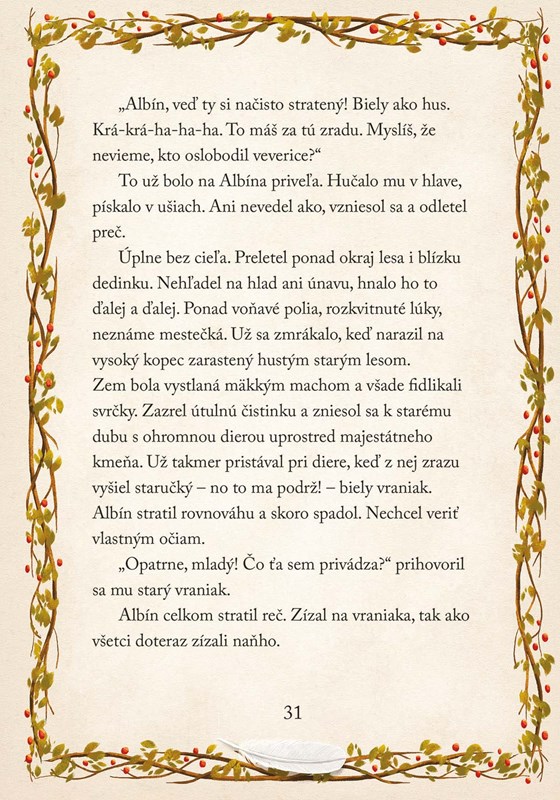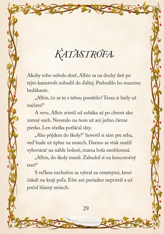 Jedného dňa, keď sa chudákovi Škrupovi prihodil v triede trapas, Albín sa ho pred celým kŕdľom odvážne zastal. Vtedy sa mu na chvoste objavilo prvé biele pierko...