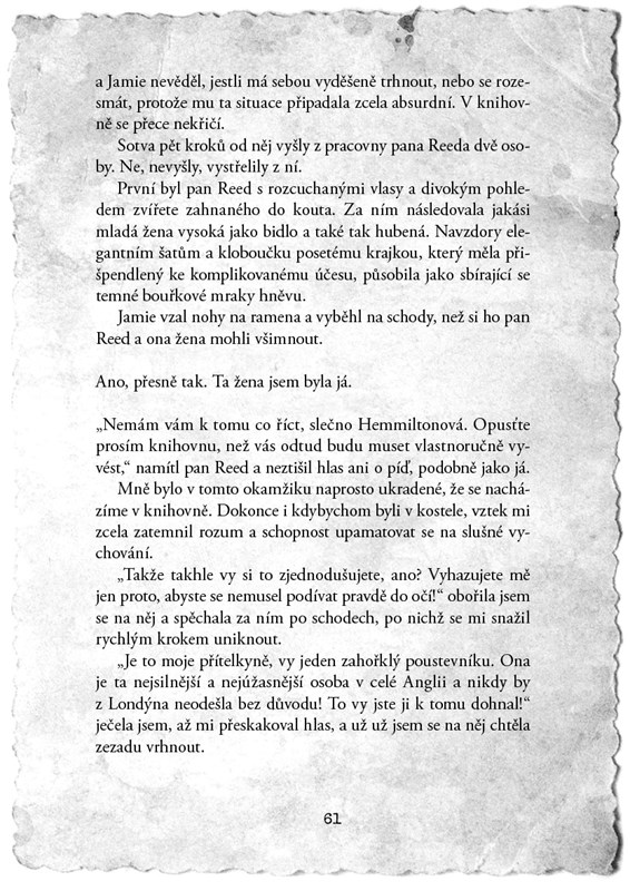 Jelikož však Jamie kategoricky odmítá, že by měl to, co jsme společně zažili, zvěčnit na papír, zůstává tento úkol na mně – Elise Hemmiltonové. Neohrožené laické vyšetřovatelce, zvědavé čmuchalce a neodolatelné lamačce srdcí.
