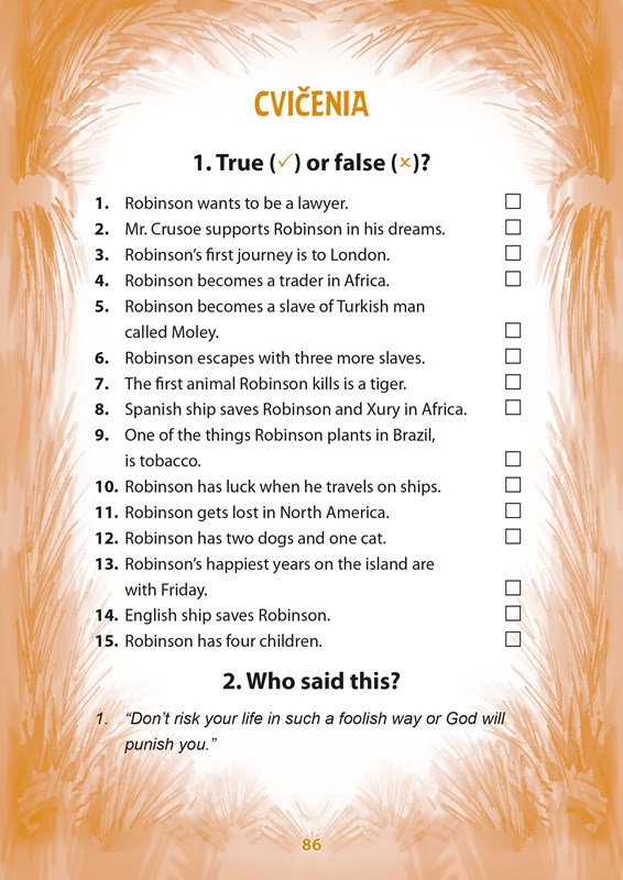 Sám na pustom ostrove uprostred oceánu... Je vôbec možné zostať nažive medzi divokými šelmami, nebezpečnými morskými tvormi a kanibalmi? Čítajte príbeh Robinsona, ktorý prežil na opustenom tropickom ostrove neuveriteľných 28 rokov, a študujte pri tom angličtinu!