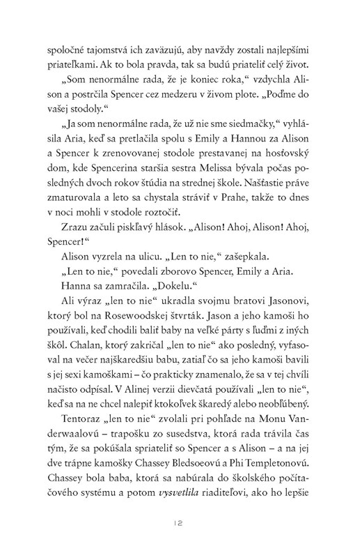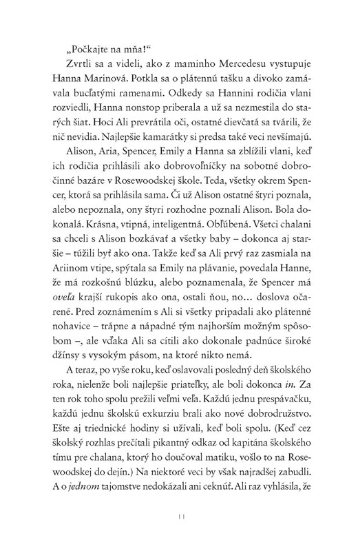 Spencer prahne po priateľovi svojej sestry. Aria sa zapletie s mladým učiteľom angličtiny. Emily premýšľa, prečo oveľa radšej trávi čas s novou babou ako s vlastným frajerom. A Hanna spraví čokoľvek, aby zostala krásna a populárna. Všetky spolu však skrývajú tajomstvo väčšie a temnejšie, než si dokážete predstaviť. Odkedy pred troma rokmi zmizla ich kamoška Alison, vydýchli si. No minulosť ich dobieha. Ako to viem? Pretože ja viem všetko – aké zlé tieto baby boli, aké nemravné sú teraz a aké špinavé tajomstvá skrývajú. A hádajte čo? Všetkým to poviem.