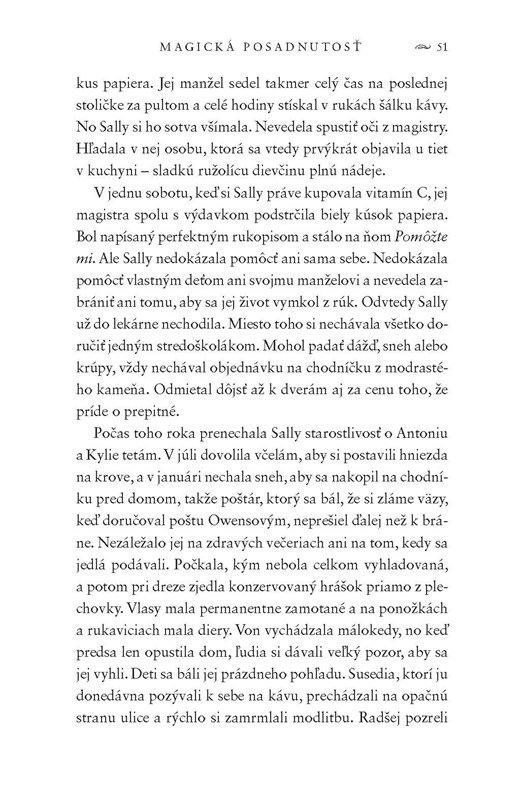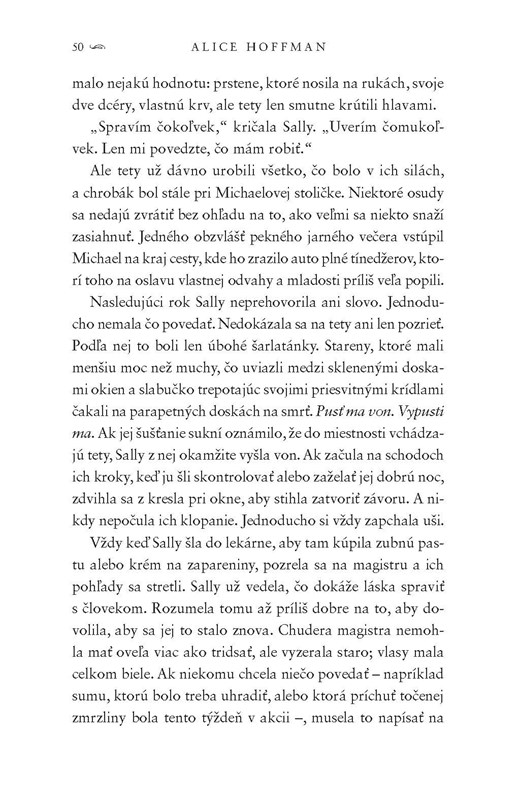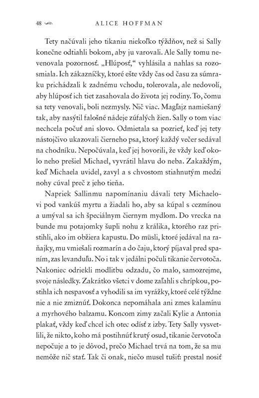 Dni sestier boli plné drobných ponížení, nik sa s nimi neodvážil hrať a väčšina z nich si prekrížila prsty, akoby sa chceli pred niečim chrániť. Také bolo ich detstvo. Keď vyrástli Gillian sa rozhodla odísť, žiť skutočný život bez Owensovej nálepky. Jej slobodná, prelietavá duša však prinesie viac smoly ako šťastia. Než sa znova stretnú prejdú roky. Budú z nich dospelé ženy príliš staré na to, aby si šepkali do ucha tajnosti. Každá si žije svoj život a napriek tomu ich to magický spojí, pretože v nich prúdi rovnaká krv Owensových...