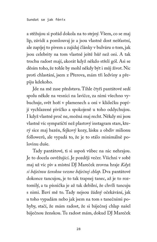 Novela Sundat se jak fénix vypráví příběh autorčina alter ega, zpěvačky Emy. Je svého druhu vtipnou a ostrou generační výpovědí a týká se problémů a úzkostí, kterým dnešní třicátníci často čelí. Je záznamem o tom, jak nás doba žene do větších a větších výkonů, zprávou o tom, jakou srovnávací pastí jsou sociální sítě a média, kdy náš obraz v nich často považujeme za důležitější než to, jaký je náš svět reálně je, a jak se, pokud nedosahujeme úspěchů a permanentního „štěstí“, považujeme za méněcenné.