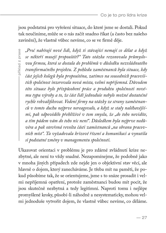 Tato kniha je o tom, jak se v krizích chovat k zaměstnancům, aby podporovali svého zaměstnavatele, a to i když okolnosti nejsou jednoduché. Je určena manažerům na všech úrovních. Všechny rady a doporučení, která zde najdete, jsme načerpali v průběhu koronavirové pandemie a před ní, jsou z českých nebo v České republice působících firem. Všechny jsou více či méně přenositelné do jiných firem.