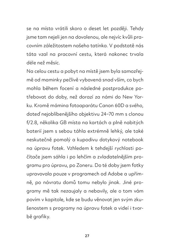 K digitální zrcadlovce jsem se dostala už na základce – a od té doby jsem focením posedlá. Za to, že mě tahle vášeň neopustila, může moje mamka. A plnou důvěru jsem vždycky měla i od táty, který podporuje všechny moje bláznivé nápady. Jako třeba napsat tuhle knihu o fotkách a jejich příbězích.